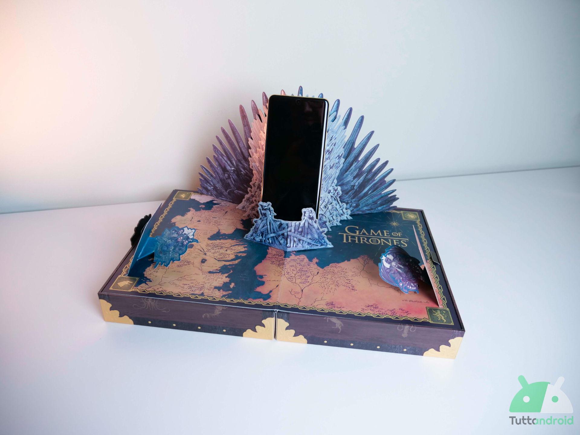 Ogni accessorio è tematizzato: il pin per la SIM ha la forma della Mano del Re, la lettera in pergamena è “bianca” finché non viene esposta alla luce, rivelando un messaggio segreto grazie a un’inchiostrazione fotocromatica, come evocata dal fuoco magico di Melisandre. Ci sono poi cartoline collezionabili, adesivi e un case in TPU trasparente con il sigillo Targaryen ben visibile.