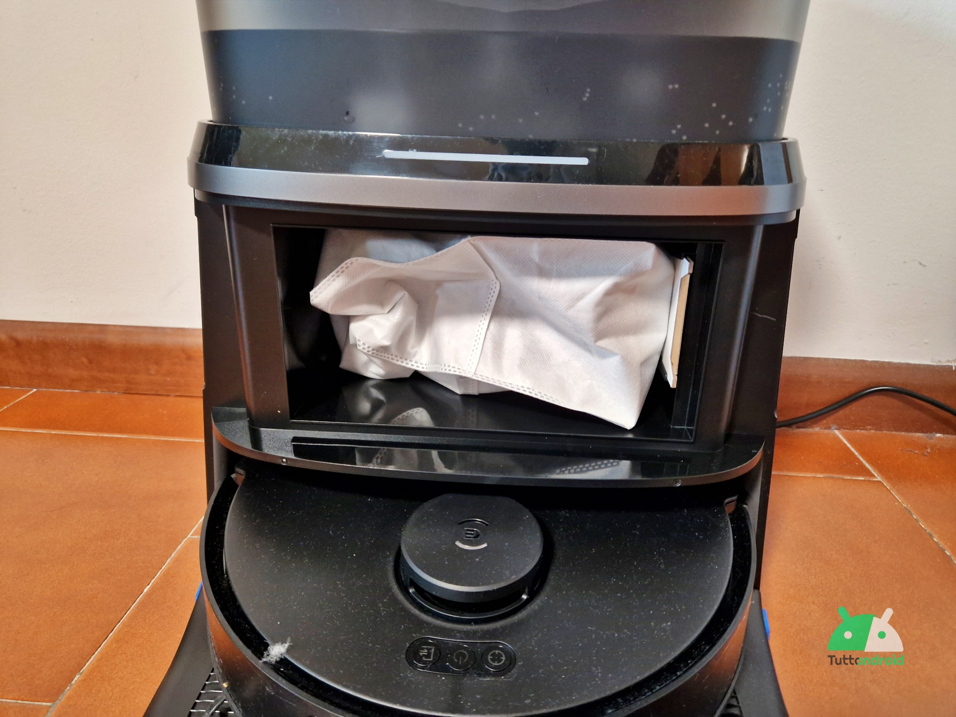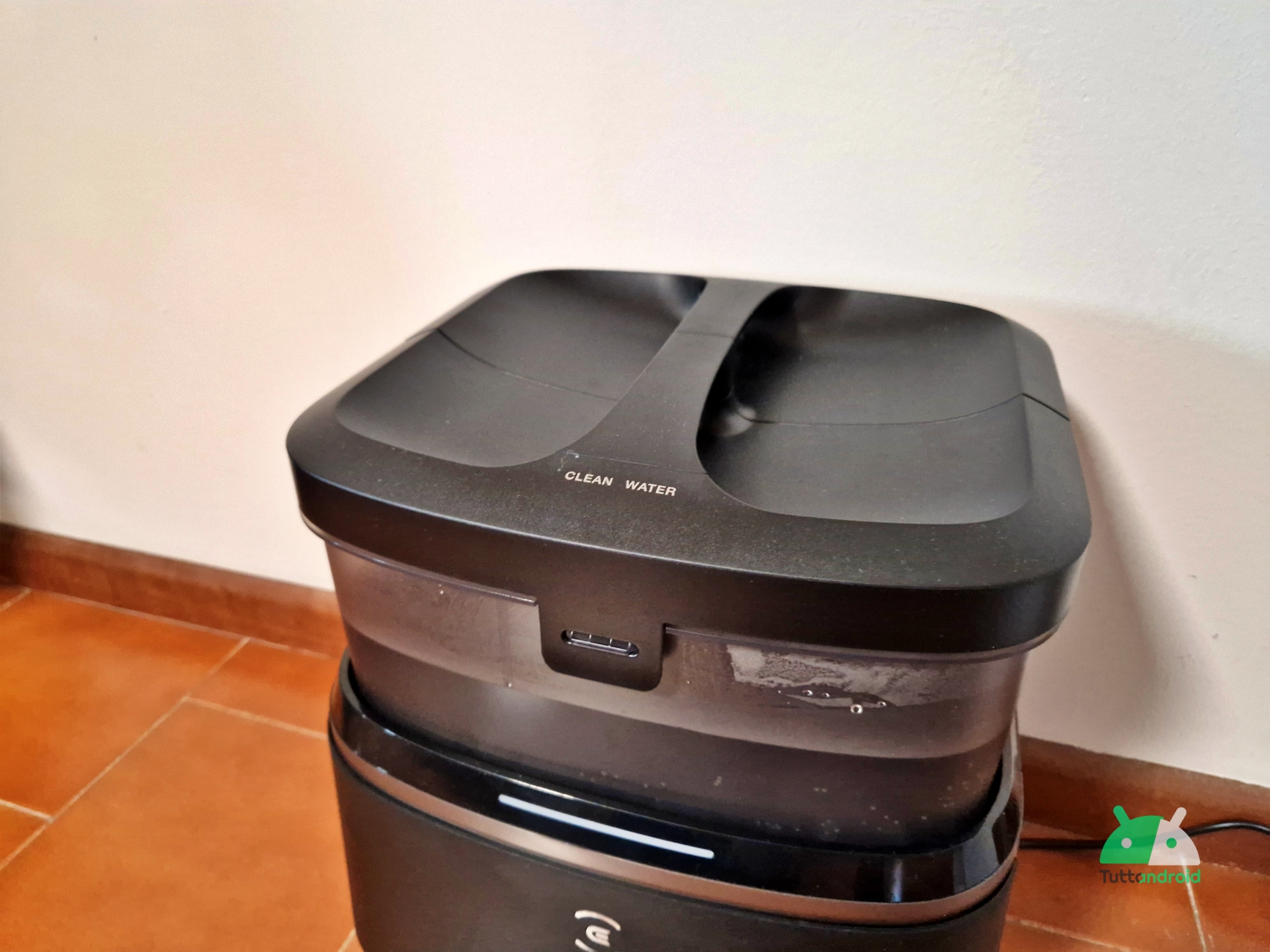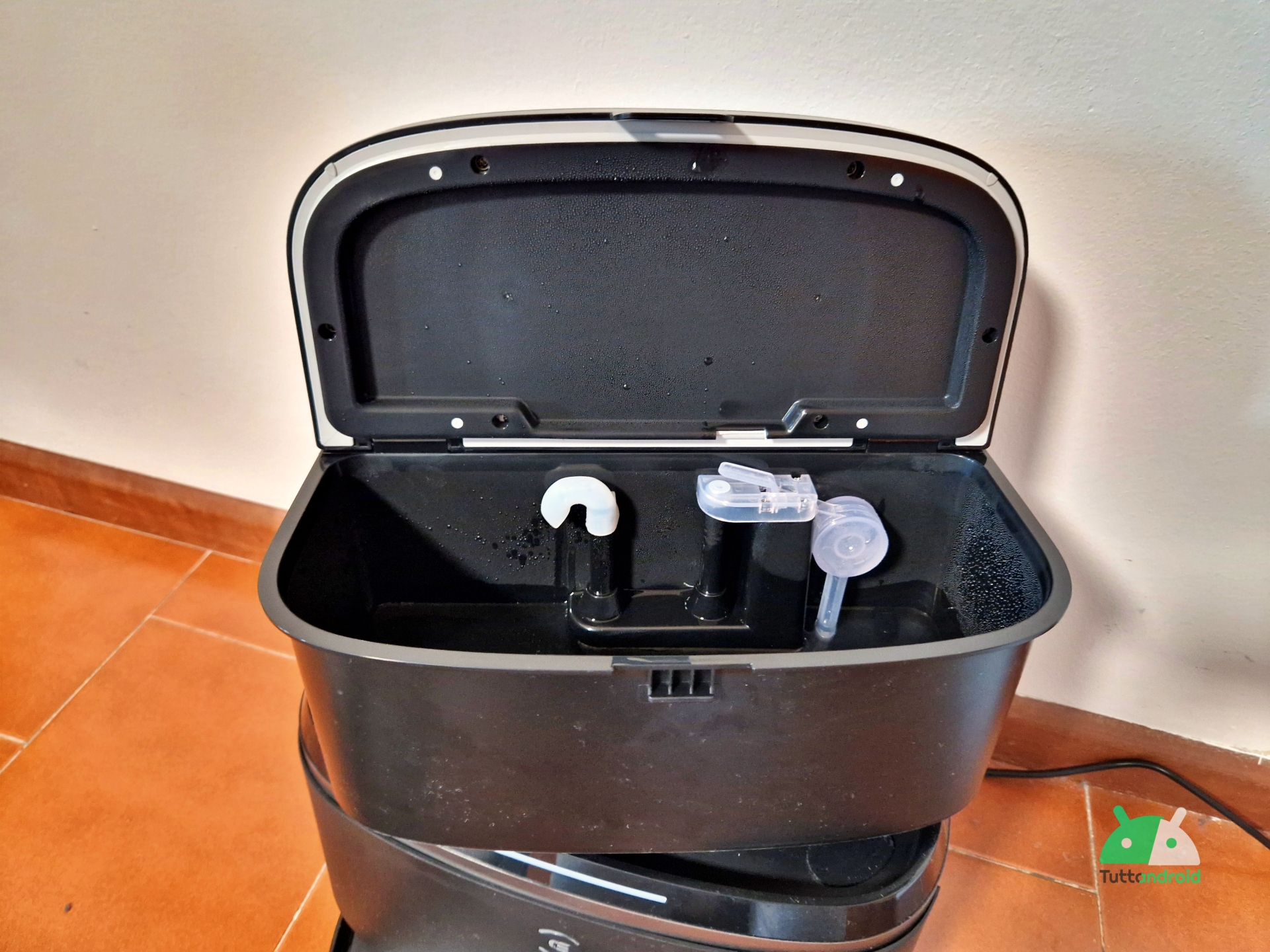Tutto questo non comporta alcuna rinuncia, visto che la base è comunque completa di ogni funzionalità. Si parte, ovviamente, dalla ricarica della batteria interna del robottino, passando per l’aspirazione della polvere raccolta, convogliata in un apposito sacchetto, passando per la ricarica del serbatoio interno utilizzando l’apposita tanica d’acqua pulita. Quest’ultima viene utilizzata anche per il lavaggio dei moci rotanti, che avviene scaldando l’acqua fino a 70 gradi, per una rimozione ancora più accurata di grasso e sporco.
