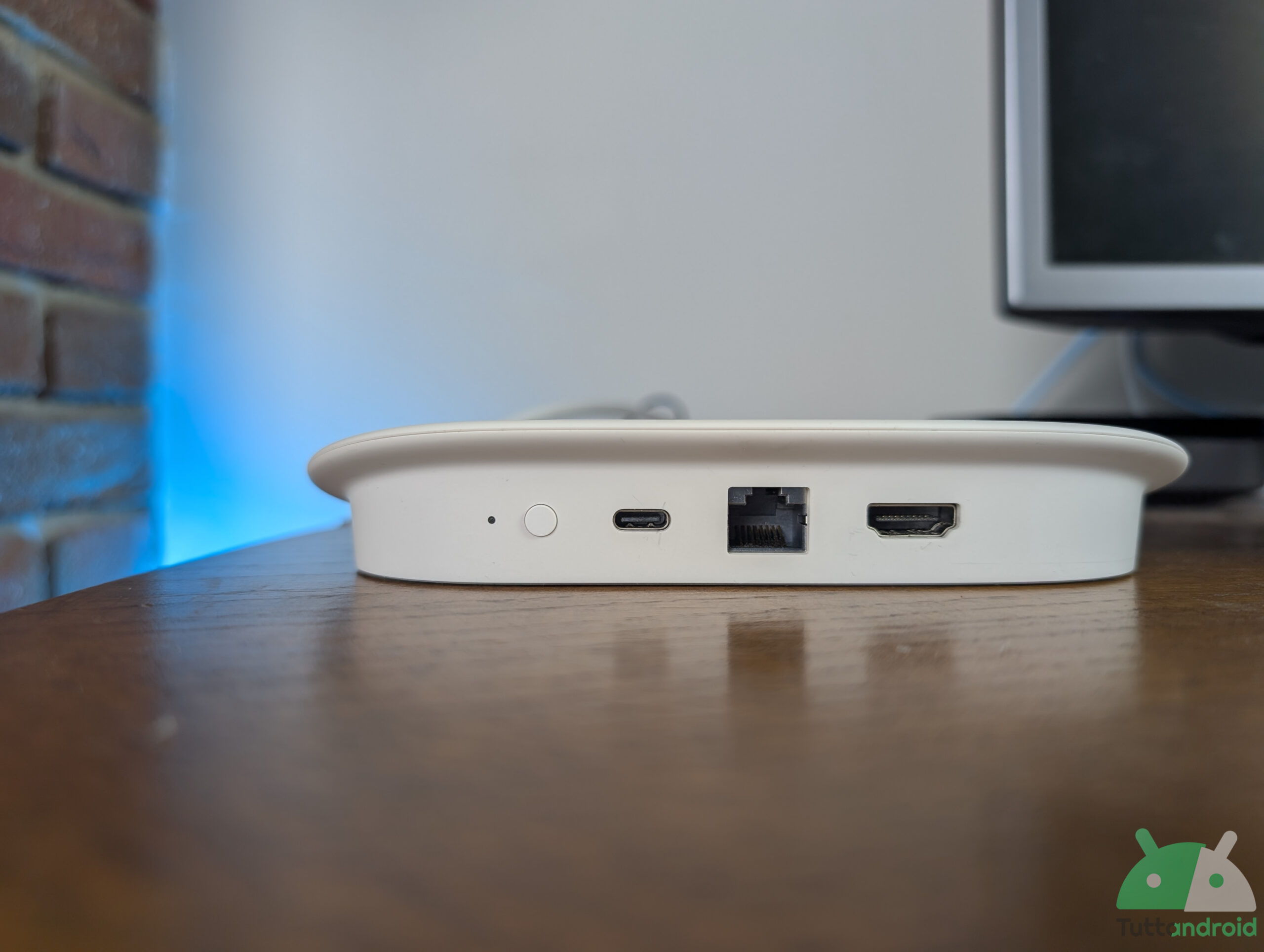 La forma diversa di questo nuovo device ha permesso a Google di trovare il posto per una porta Ethernet Gigabit e dell’hardware necessario per fungere da router di confine Thread. Sulla parte posteriore troviamo anche la porta HDMI 2.1 (limitata alla banda della HDMI 2.0) e una porta type-c per il collegamento dell’alimentazione e di eventuali hub multiporta per chiavette USB o schede di memoria. Infine c’è un piccolo tastino che consente di far suonare il telecomandino di controllo, una funzione molto utile e apprezzata.