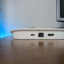 La forma diversa di questo nuovo device ha permesso a Google di trovare il posto per una porta Ethernet Gigabit e dell’hardware necessario per fungere da router di confine Thread. Sulla parte posteriore troviamo anche la porta HDMI 2.1 (limitata alla banda della HDMI 2.0) e una porta type-c per il collegamento dell’alimentazione e di eventuali hub multiporta per chiavette USB o schede di memoria. Infine c’è un piccolo tastino che consente di far suonare il telecomandino di controllo, una funzione molto utile e apprezzata.