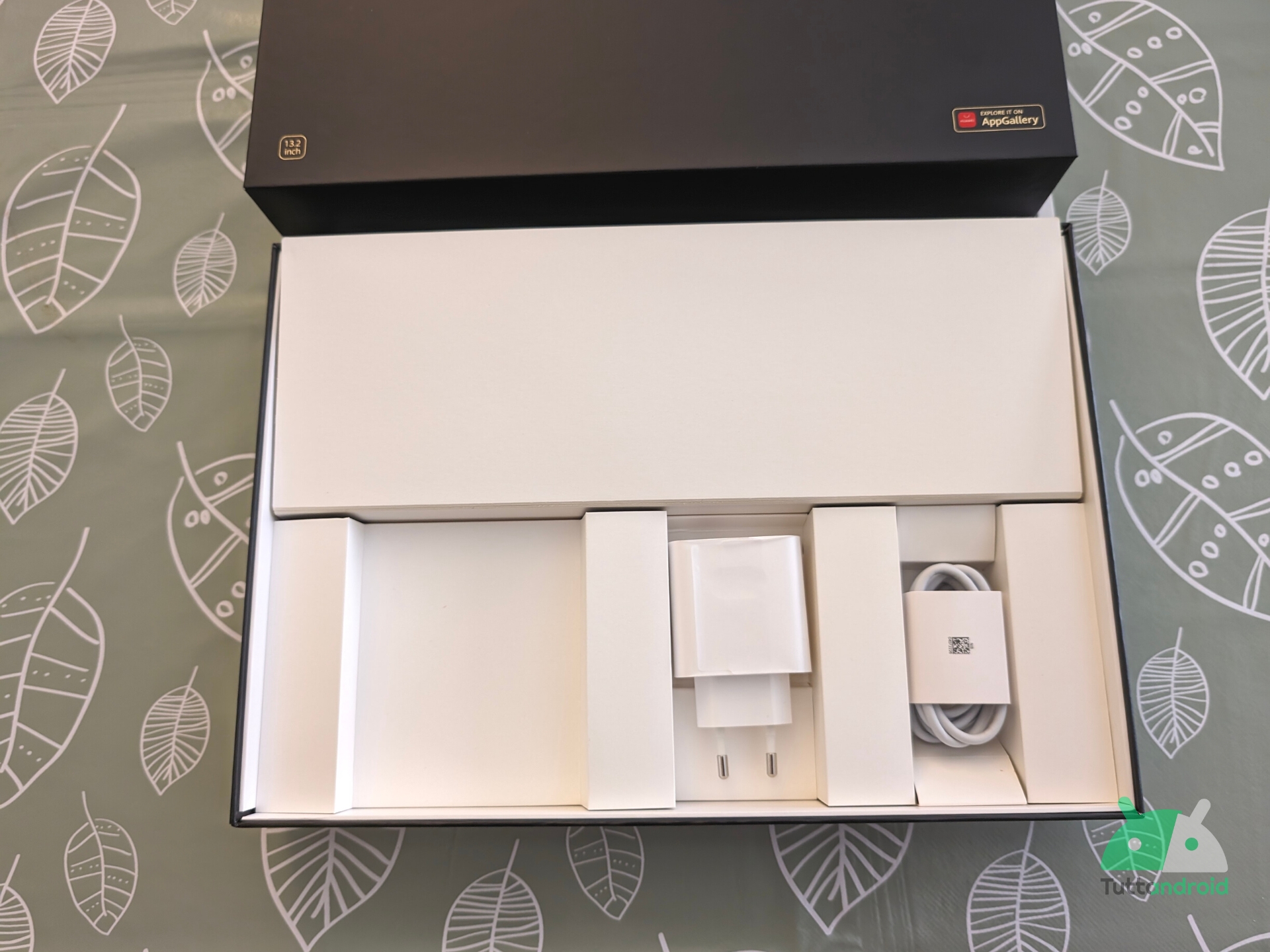 Prima di addentrarci nel cuore della recensione, è bene analizzare il contenuto della confezione di vendita di HUAWEI MatePad Pro 13.2: al suo interno, oltre al tablet e alla manualistica rapida, troviamo un cavo di ricarica/trasferimento dati da USB-A a USB-C e un alimentatore HUAWEI SuperCharge da ben 88 W che mette a disposizione una porta USB-A e una USB-C, concedendo grande versatilità ma non permettendo la ricarica contemporanea di più dispositivi vista la disposizione delle porte.