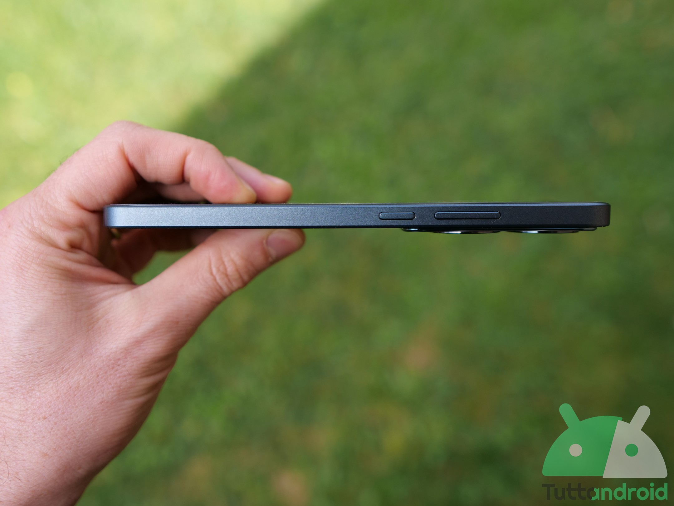 Il frame è in plastica, così come la back cover, ma la sensazione trasmessa in mano è di grande qualità ed è impreziosita dalla certificazione IP65 contro acqua e polvere. Sulla destra sono presenti il bilanciere del volume e il tasto di accensione, entrambi hanno un buon feedback e sono posizionati ad un’altezza comoda, il lato sinistro è pulito ad eccezione del cassettino per le due nanoSIM o 1 nanoSIM+microSD, il lato inferiore ospita la griglia per lo speaker di sistema mentre in alto troviamo il foro per il microfono principale. Nonostante dimensioni generose (161.1 x 74.7 x 7.5 mm) l’ergonomia è molto buona, per altro avvantaggiata da un peso di soli 177 grammi.