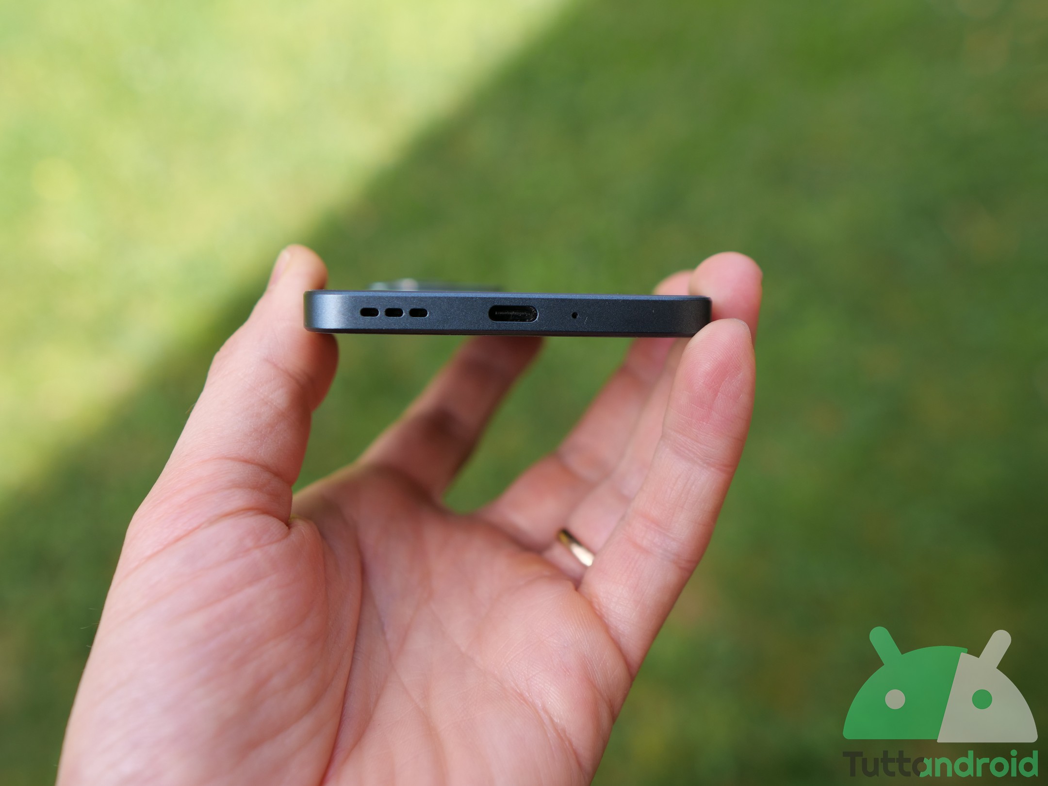 Frontalmente la superficie è quasi completamente occupata dal display, con cornici molto contenute e simmetriche per i lati corti e lunghi, al centro lo schermo è interrotto da un piccolo foro per la fotocamera frontale. Segnaliamo inoltre che di fabbrica lo smartphone esce con una pellicola protettiva preapplicata di discreta qualità.