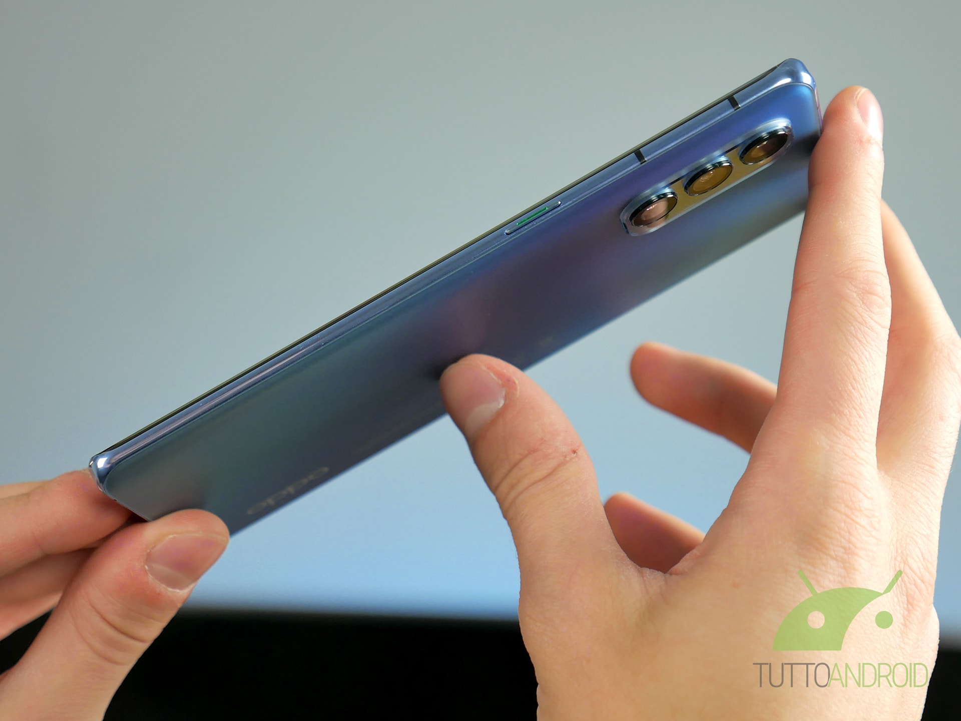 Croce e delizia non solo per Reno 4 Pro, ma pure per altri device come Samsung Galaxy Note 20: il retro in vetro. È satinato e non trattiene alcuna ditata, il ché è magnifico. Ha un buon touch and feel, il peso di 172 grammi è contenuto e lo spessore è da 7,6 mm.