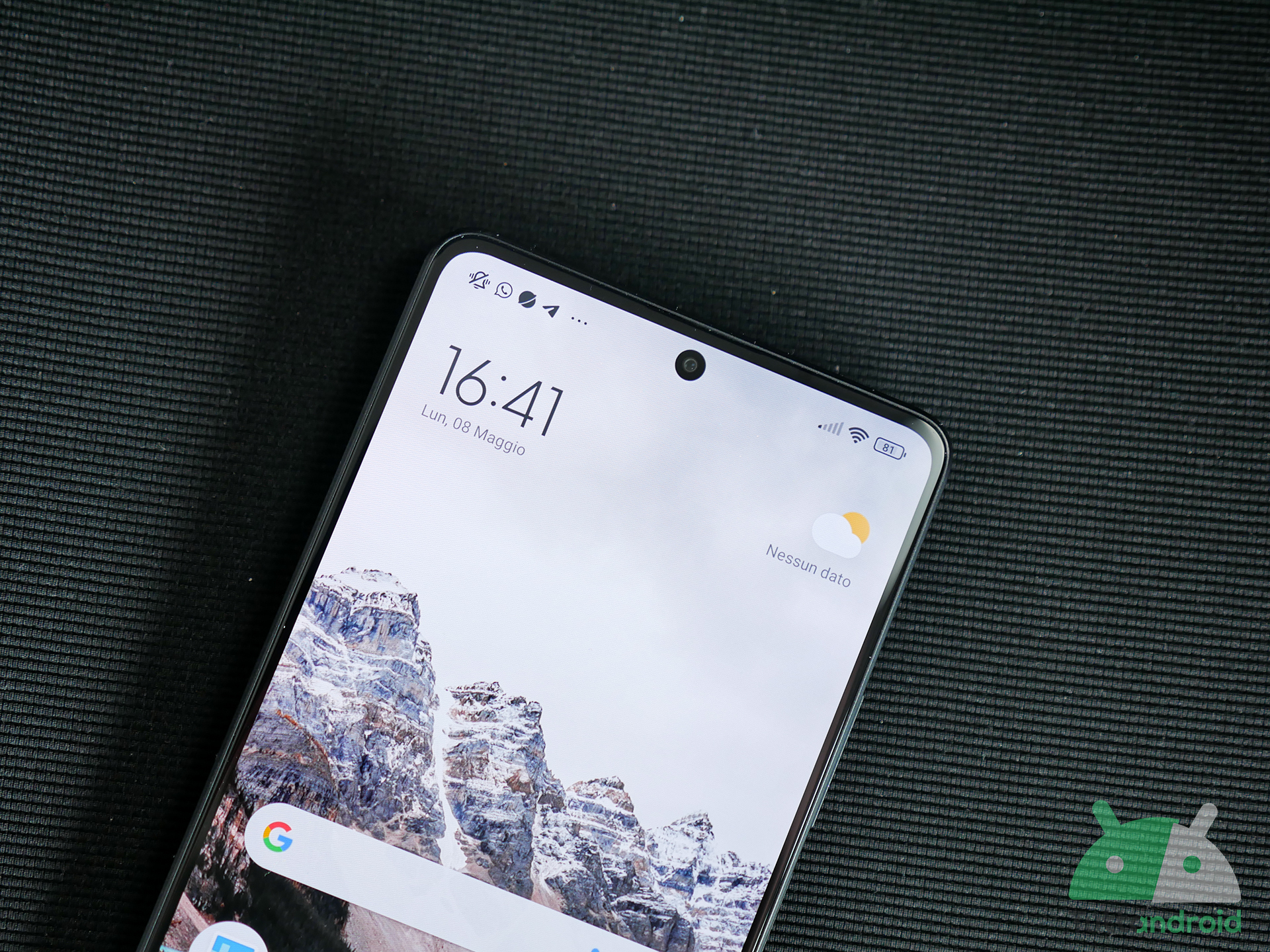 Frontalmente invece è interessante: il vetro ha certificazione Gorilla Glass 5, i bordi sono molto sottili e lasciano quasi totalmente spazio all’ampio display, interrotto da un singolo foro in alto al centro per la fotocamera selfie. Lo schermo è di tipo AMOLED da 6.67 pollici, con una risoluzione di 1080 x 2400 pixel, e un rapporto schermo-corpo del 88.9%. La scelta dell’AMOLED e l’alta frequenza di aggiornamento di 120Hz garantiscono un’esperienza visiva fluida e colori brillanti. Il display supporta 68B di colori, Dolby Vision e HDR10+, per offrire un’esperienza visiva vivida. Non spicca invece la luminosità che ha un picco massimo fino a 1000 nits riducendo in parte la visibilità in condizioni di luce intensa, come ad esempio sotto al diretta luce del sole.
