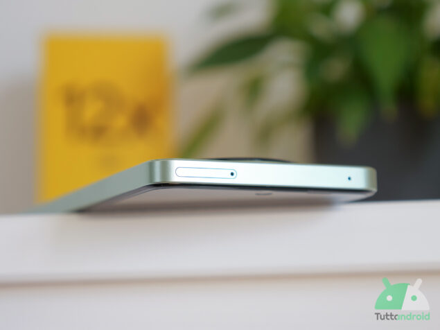 Passando sul fronte troviamo un ampio display da 6,72 pollici Full-HD+ (con risoluzione 1080 x 2400 pixel) a tecnologia LCD con frequenza di aggiornamento di 120 Hz, simile al Realme 12 5G. È interrotto sulla parte superiore, al centro, da un foro che è leggermente più grosso del solito, probabilmente per permettere l’attivazione delle air gesture, tramite la fotocamera frontale, di cui parleremo nei prossimi paragrafi.