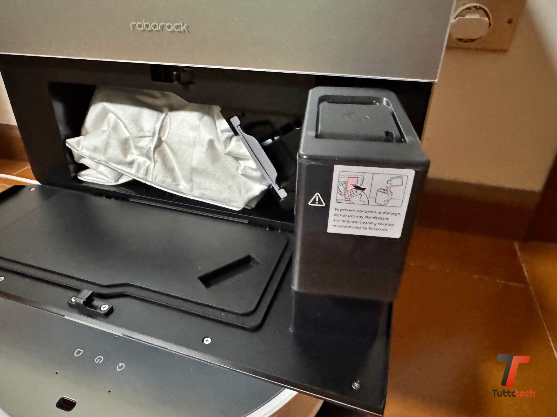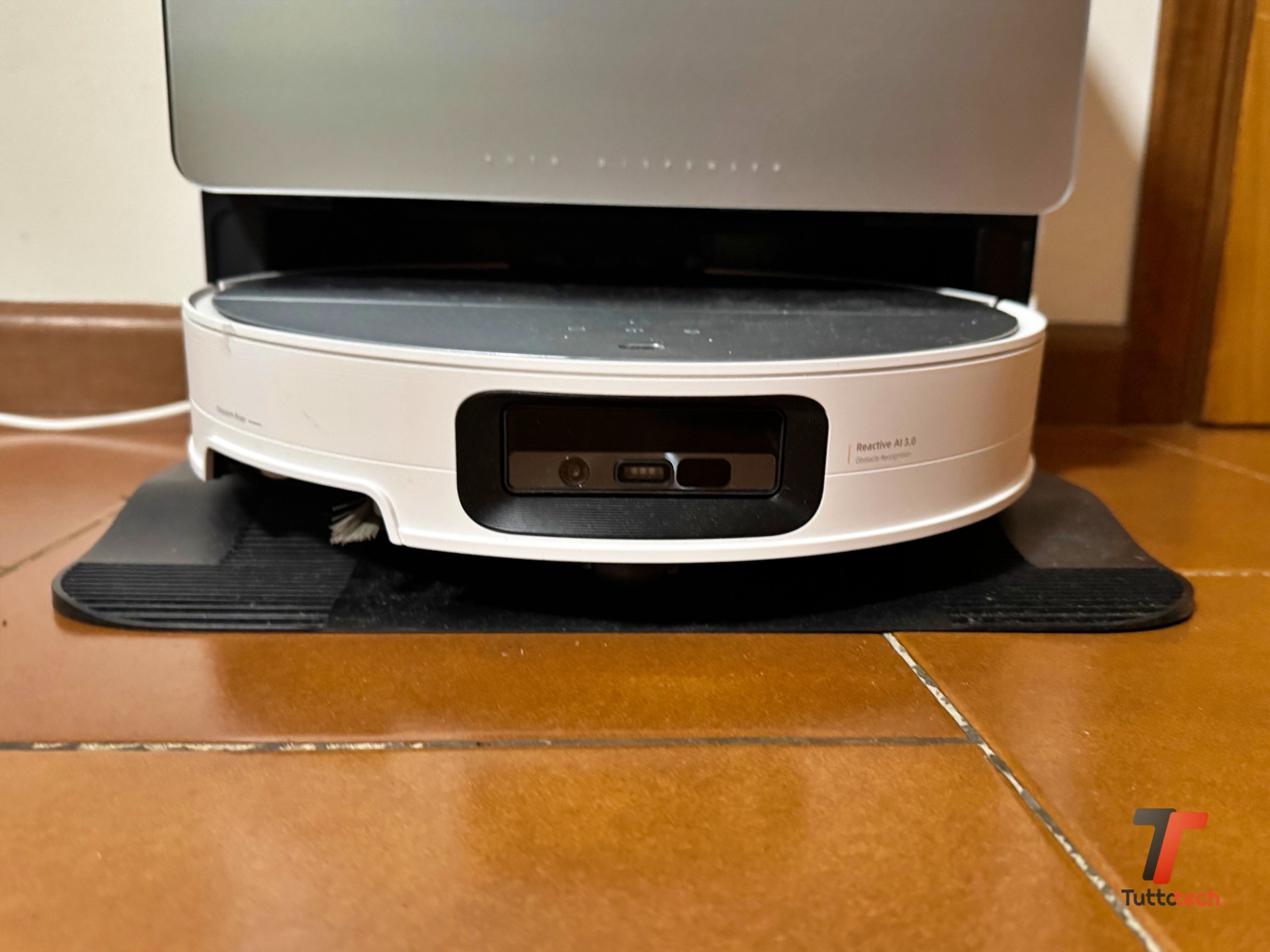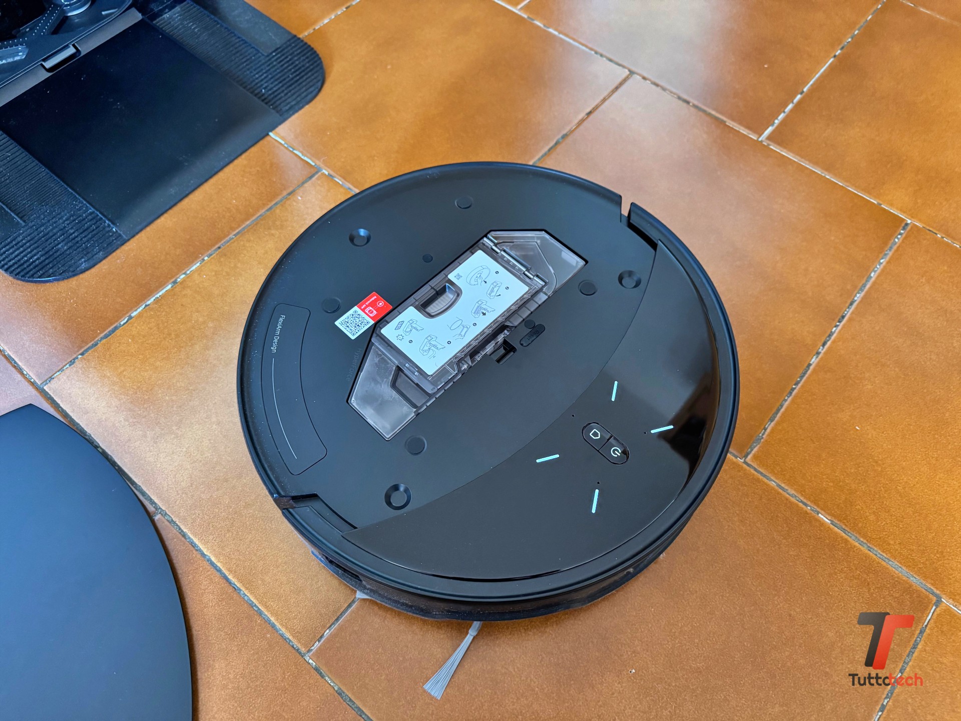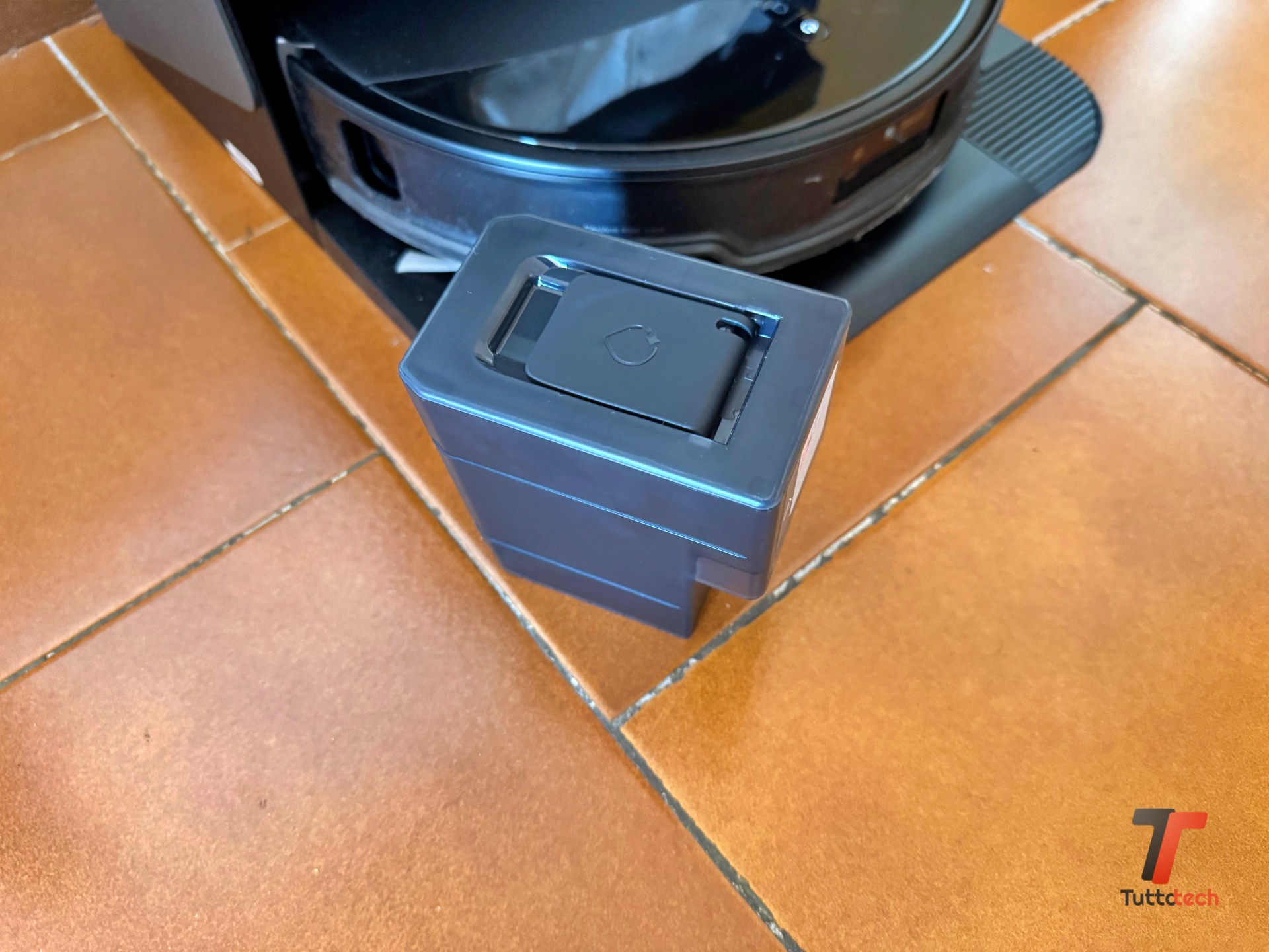 La stazione di lavaggio è decisamente evoluta e nasconde, sotto a un coperchio, i due contenitori per acqua pulita e acqua sporca. Appena sopra all’alloggiamento del robottino è presente uno sportello che nasconde il sacchetto della polvere e il contenitore per il detergente, che viene aggiunto autonomamente dal robot in base alle dimensioni delle stanze da pulire.