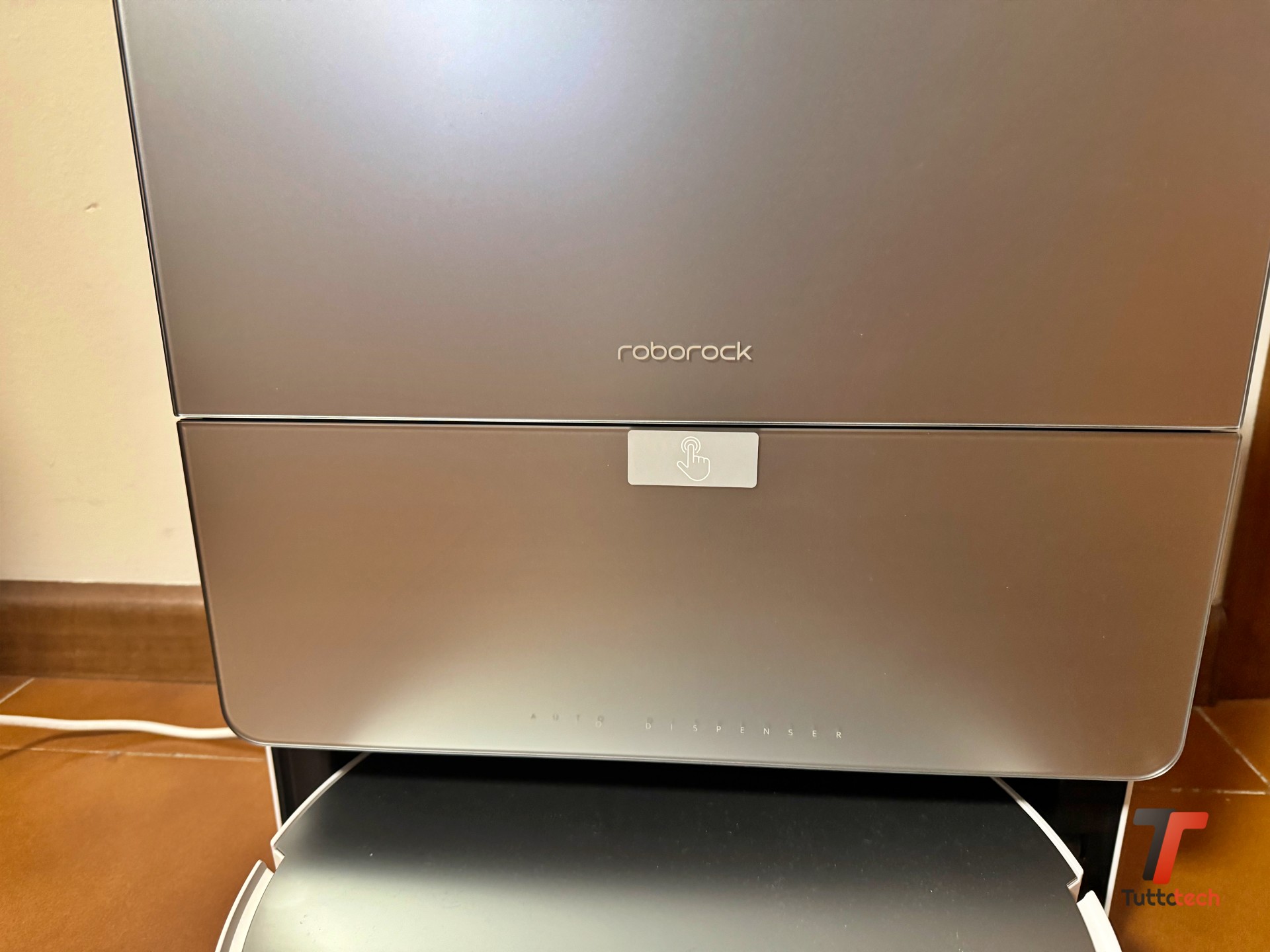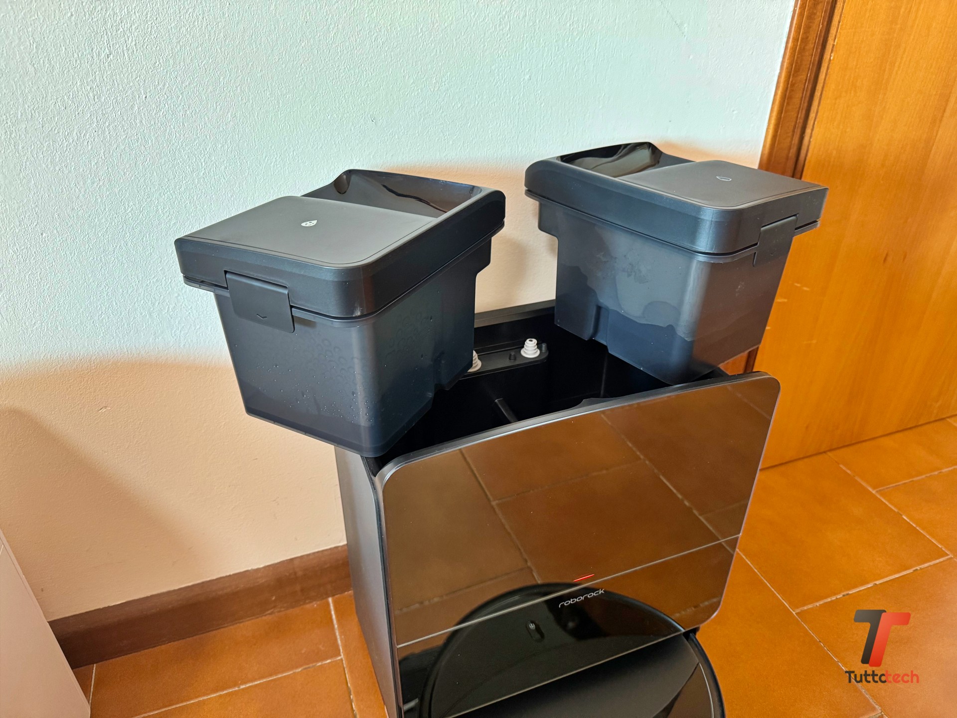 La stazione di ricarica è simile nel design, ma in questo caso i due serbatoi per l’acqua pulita non sono protetti da uno sportello. Appena sopra all’alloggiamento del robot è presente uno sportello da rimuovere per accedere al sacchetto della polvere e al serbatoio per il detergente, che viene aggiunto automaticamente insieme all’acqua pulita.