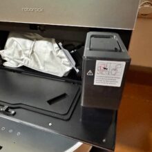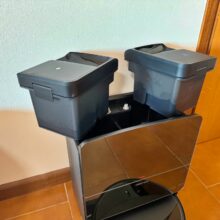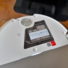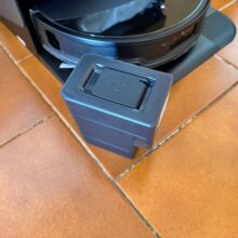La stazione di ricarica è simile nel design, ma in questo caso i due serbatoi per l’acqua pulita non sono protetti da uno sportello. Appena sopra all’alloggiamento del robot è presente uno sportello da rimuovere per accedere al sacchetto della polvere e al serbatoio per il detergente, che viene aggiunto automaticamente insieme all’acqua pulita.