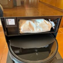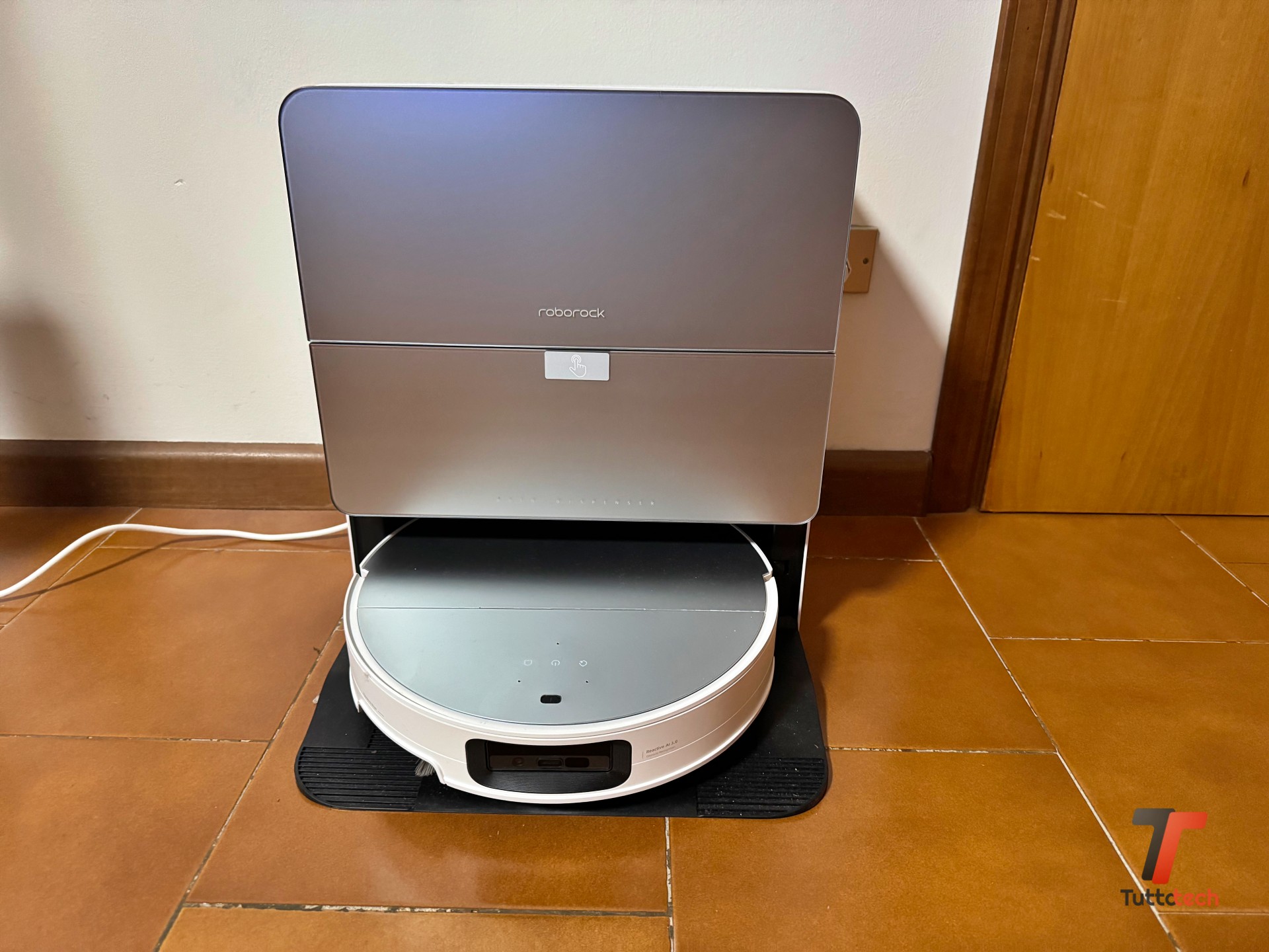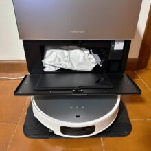 La stazione di lavaggio è decisamente evoluta e nasconde, sotto a un coperchio, i due contenitori per acqua pulita e acqua sporca. Appena sopra all’alloggiamento del robottino è presente uno sportello che nasconde il sacchetto della polvere e il contenitore per il detergente, che viene aggiunto autonomamente dal robot in base alle dimensioni delle stanze da pulire.