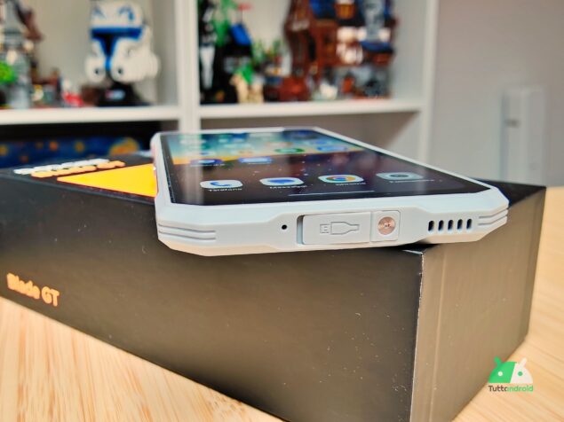 Solitamente, come dicevamo in apertura, i rugged phone sono dei dispositivi particolarmente pesanti e tozzi, con linee molto squadrate e uno spessore elevato. DOOGEE Blade GT è invece un dispositivo in controtendenza e lo si nota già dalle linee. La parte frontale ricorda in effetti buona dei modelli di questo tipo, con gli angoli smussati per attutire meglio eventuali impatti, cornici decisamente ampie ma utili per ridurre il rischio di danni allo schermo in caso di caduta.