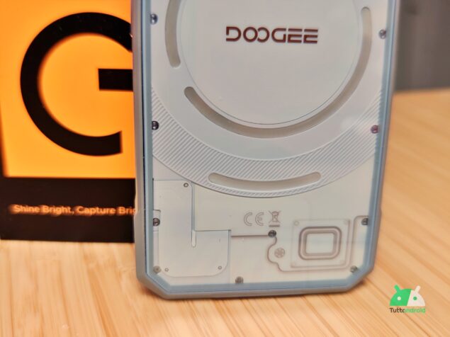 Di questo e delle prestazioni vi parleremo però tra poco, perché vale pena di soffermarsi sul design della parte posteriore, e sulla soluzione adottata da DOOGEE per migliorare la durabilità di questo dispositivo, un vero e proprio camaleonte. La cover posteriore si rifà chiaramente a Nothing Phone (1), uno degli smartphone più particolari degli ultimi anno.