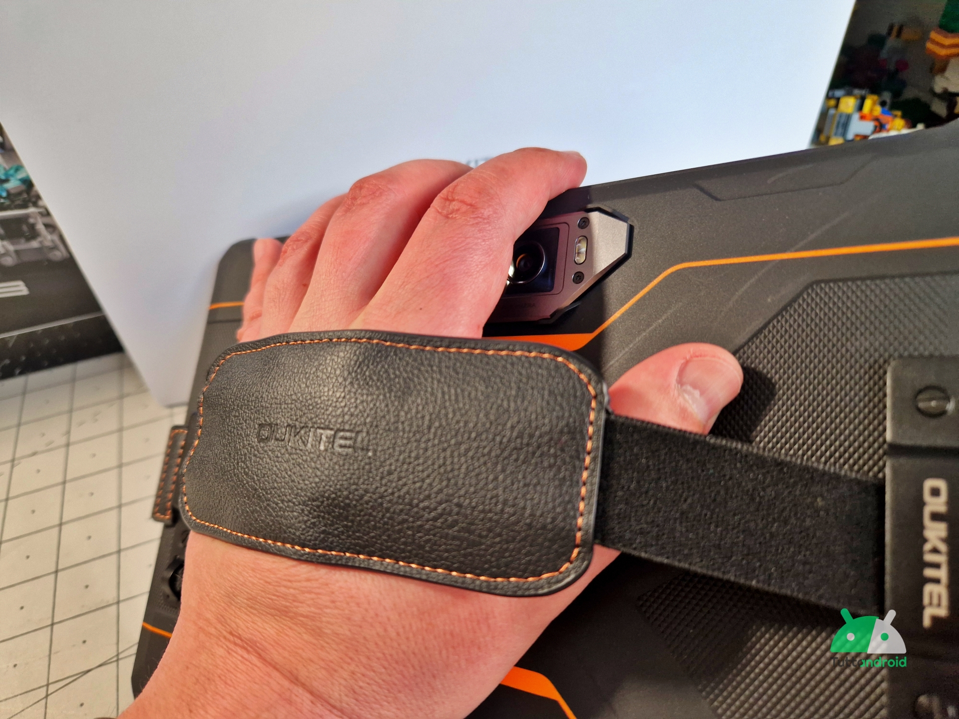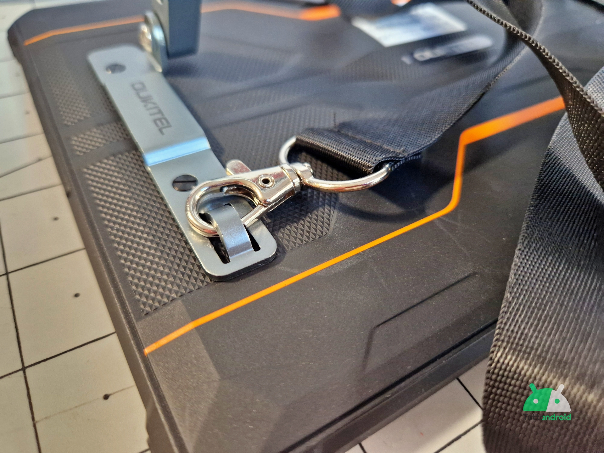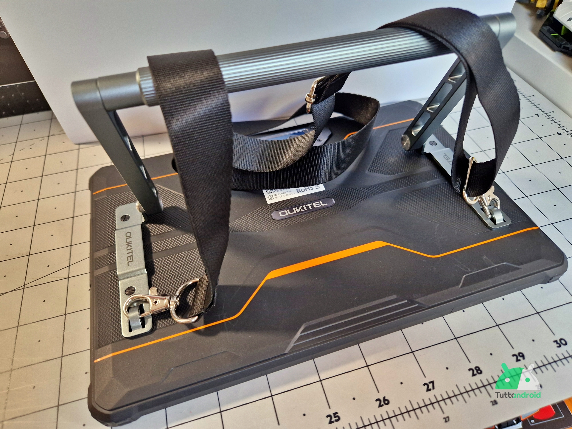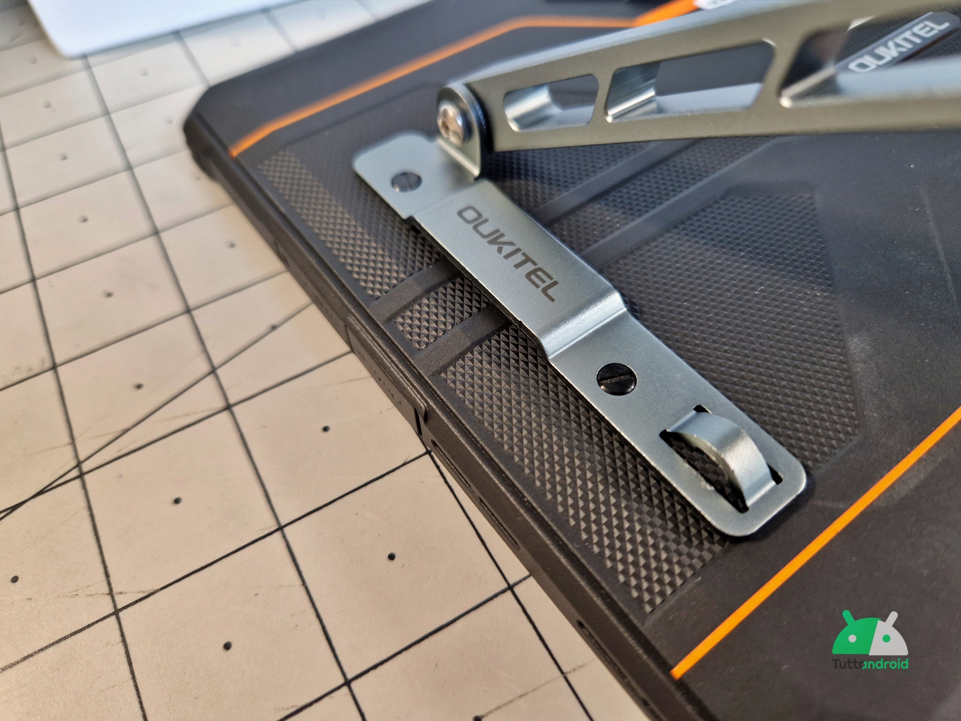 Il comparto fotografico è sicuramente anomalo per un tablet, almeno per questa tipologia di prodotto, ma OUKITEL ha pensato anche ad altre chicche per renderlo ancora più semplice e comodo da usare. Nella parte posteriore del tablet sono infatti presenti quattro piccoli fori filettati, pronti per accogliere altrettante viti. Queste ultime servono per fissare i due accessori inclusi nella confezione di vendita: una fascia elastica e una staffa in ferro.