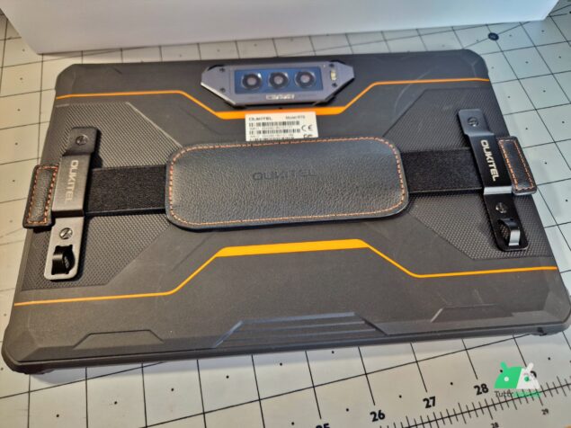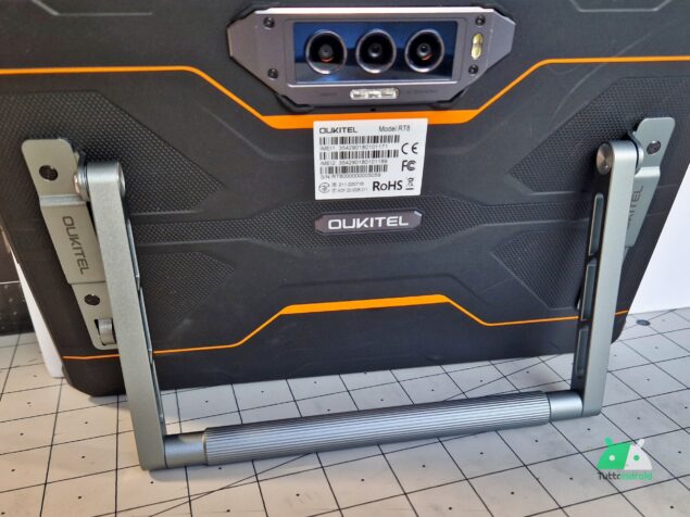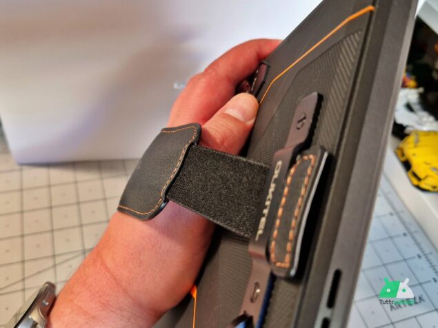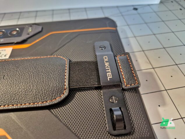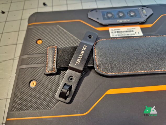 Il comparto fotografico è sicuramente anomalo per un tablet, almeno per questa tipologia di prodotto, ma OUKITEL ha pensato anche ad altre chicche per renderlo ancora più semplice e comodo da usare. Nella parte posteriore del tablet sono infatti presenti quattro piccoli fori filettati, pronti per accogliere altrettante viti. Queste ultime servono per fissare i due accessori inclusi nella confezione di vendita: una fascia elastica e una staffa in ferro.