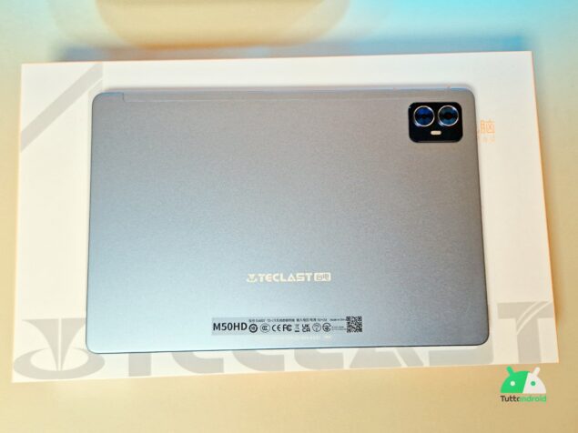 Il primo impatto con Teclast M50 HD è estremamente positivo, grazie a un design molto curato. Bordi squadrati, solo gli spigoli sono leggermente arrotondati, frame e cover posteriore in metallo, fotocamera posteriore all’interno di un elemento rettangolare che ha il solo difetto di rendere meno stabile il tablet quando è appoggiato su una superficie piana, situazione a cui siamo comunque abituati con i moderni smartphone.