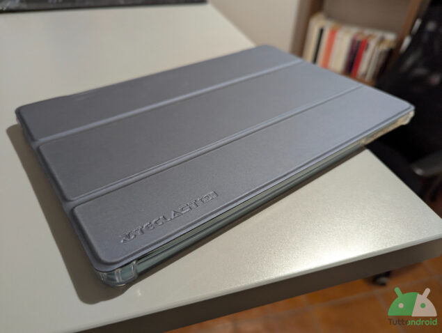 Teclast P50AI arriva con una pellicola già installata e, in confezione, ci sono anche il caricabatterie e un cavo USB-C per la ricarica, oltre a una penna che è sia una biro che uno strumento con cui gestire il tablet, toccandolo con la superficie gommosa posta all’estremità opposta. C’è inoltre un manuale, con le informazioni riportate anche in lingua italiana e una custodia a libretto, con la sezione posteriore trasparente, lucida ai bordi e opaca dietro, e con la parte anteriore grigio scuro a protezione del display. Peccato non sia utile anche come supporto fisico per tenerlo in piedi. Per inciso, volendo il modo di usarlo come supporto si trova, ma non è una custodia studiata appositamente per questo, purtroppo.