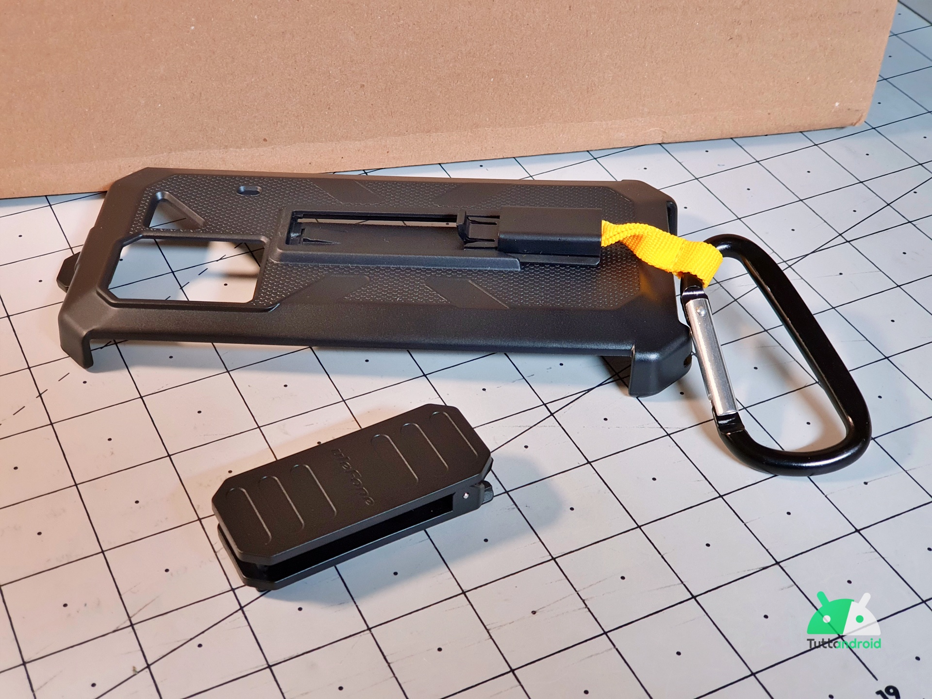 Il primo è un case in plastica rigida che fornisce una ulteriore protezione per lo smartphone, rendendolo virtualmente indistruttibile, andando a proteggere maggiormente gli angoli e il comparto fotografico. A questa cover è possibile agganciare un moschettone, per fissare lo smartphone a uno zaino, soluzione ideale per gli amanti delle escursioni o delle attività all’aria aperta, o una clip per fissare lo smartphone ai pantaloni, una soluzione comoda per chi utilizza questo smartphone per lavoro e ha bisogno di avere lo smartphone sempre a portata di mano.