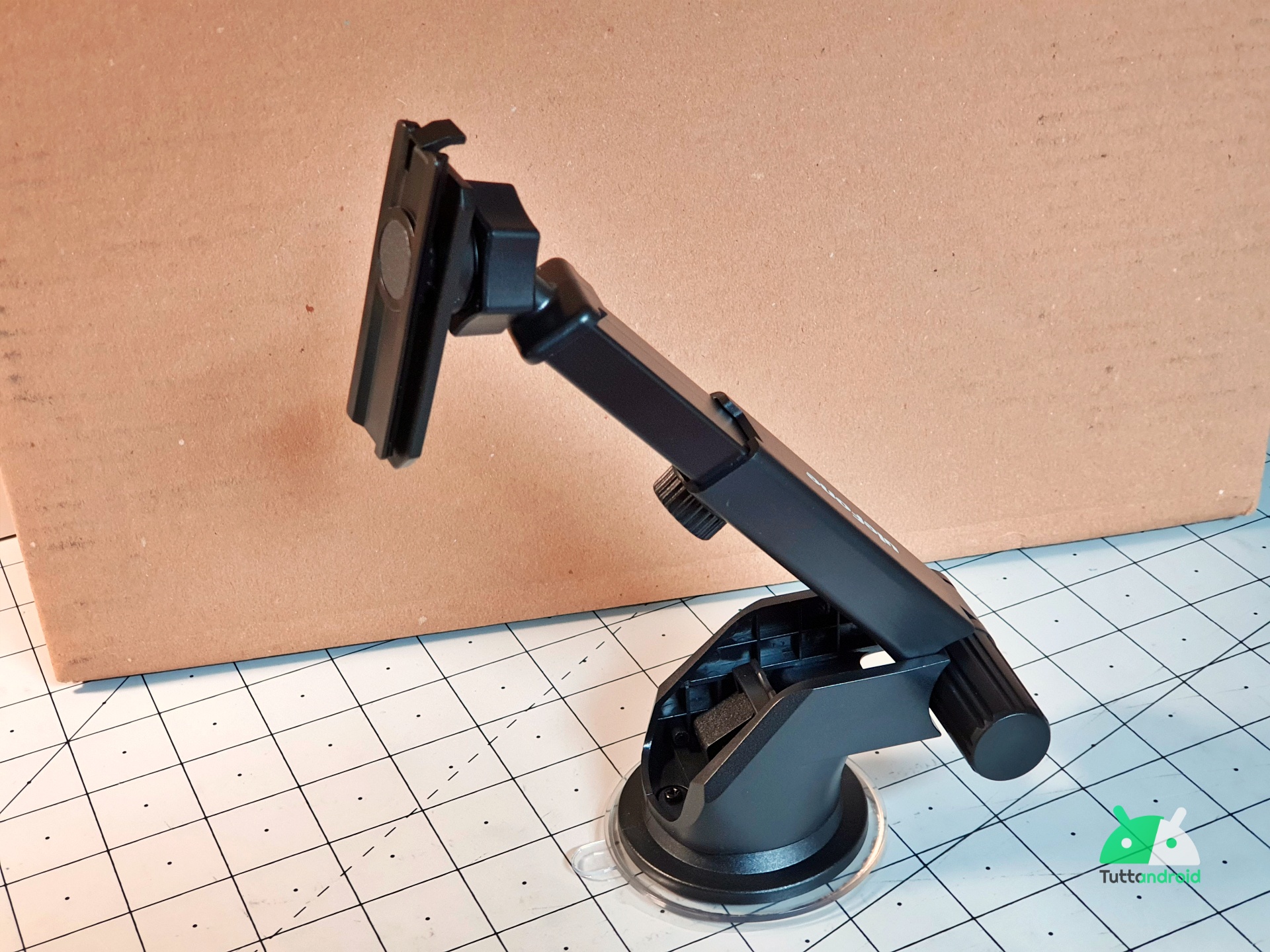 Il secondo è un supporto con ventosa che può essere utilizzato per l’auto ma anche per la scrivania o superfici lisce. È dotato di un braccio con inclinazione e lunghezza regolabile, per avere sempre lo smartphone in una posizione ben visibile durante la guida o al lavoro, senza intralciare con le normali operazioni. Richiede l’utilizzo della cover aggiuntiva visto che si fissa allo smartphone con il sistema a baionetta presente sul retro della cover aggiuntiva.