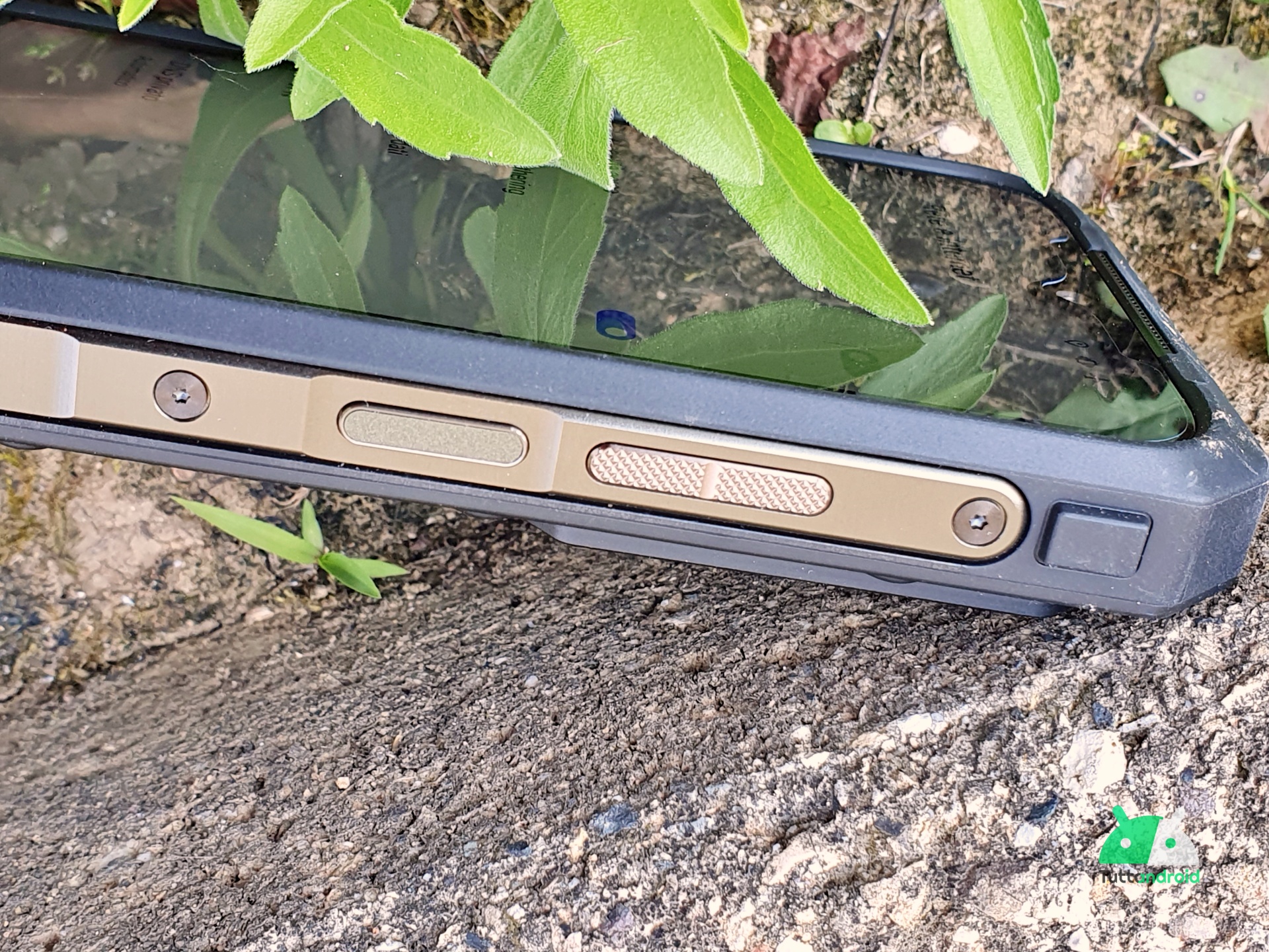 Su entrambi i lati poi sono presenti un paio di piccoli rialzi in gomma, così da poter utilizzare lo smartphone come livella senza che i vari pulsanti vadano a interferire in alcun modo. Riprendendo una scelta tipica in questo genere di smartphone, sul lato sinistro è presente un pulsante metallico zigrinato il cui funzionamento può essere personalizzato.