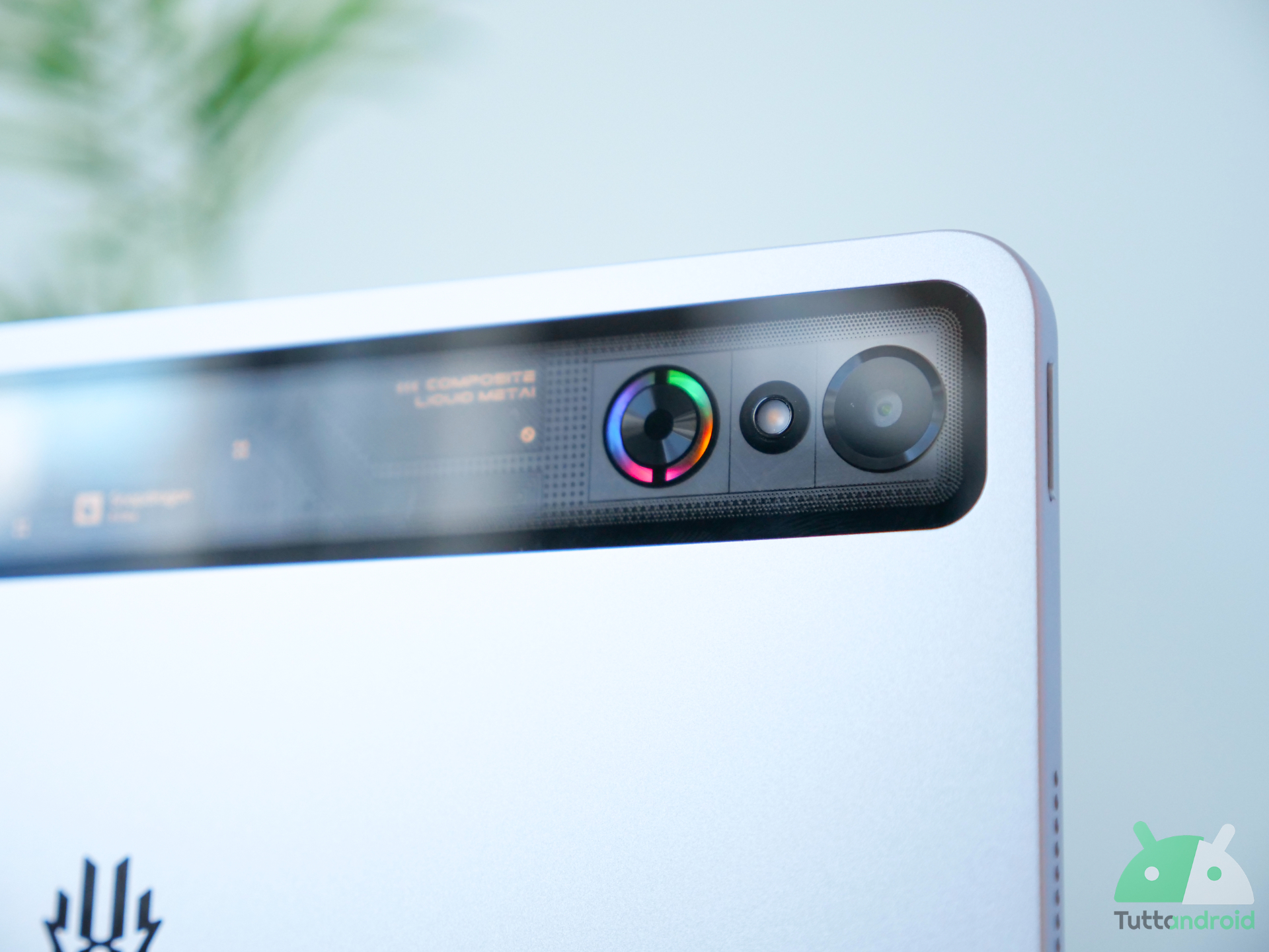 Il display OLED da 9,06 pollici con refresh rate fino a 165 Hz rappresenta una rarità nel segmento: mentre la maggior parte dei competitor adotta pannelli LCD IPS, REDMAGIC ha scelto la tecnologia OLED per garantire neri perfetti e colori vividi. La risoluzione 2.4K (2400 x 1504 pixel) in formato 16:10 offre dettagli eccellenti, mentre la luminosità raggiunge i 1600 nit di picco e 1100 nit a schermo pieno, rendendo il tablet perfettamente utilizzabile anche all’aperto. Le cornici sono ridotte a soli 4,9 mm, permettendo un rapporto schermo-corpo del 90,1% e una fotocamera frontale incredibilmente piccola (φ1.9mm) per un’esperienza più immersiva.