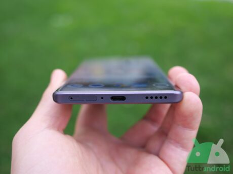 Il lato sinistro è completamente pulito, in basso trovano posto il cassettino per le due nanoSIM, la porta di tipo C, la griglia dell’altoparlante principale e un microfono; lato destro con bilanciere del volume e tasto di accensione, superiormente altri due microfoni. Un particolare curioso è il flash LED circolare chiamato Aura Light che ha la funzione di illuminare correttamente il viso (può illuminare con diverse temperature di luce) di chi viene fotografato, coadiuvato da un sensore di frequenza della luce che è posizionato appena al di sotto di esso.