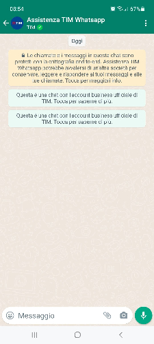 6. Seleziona la voce “Messaggia +39 335 123 7272” per avviare la chat con l’account business ufficiale di TIM.