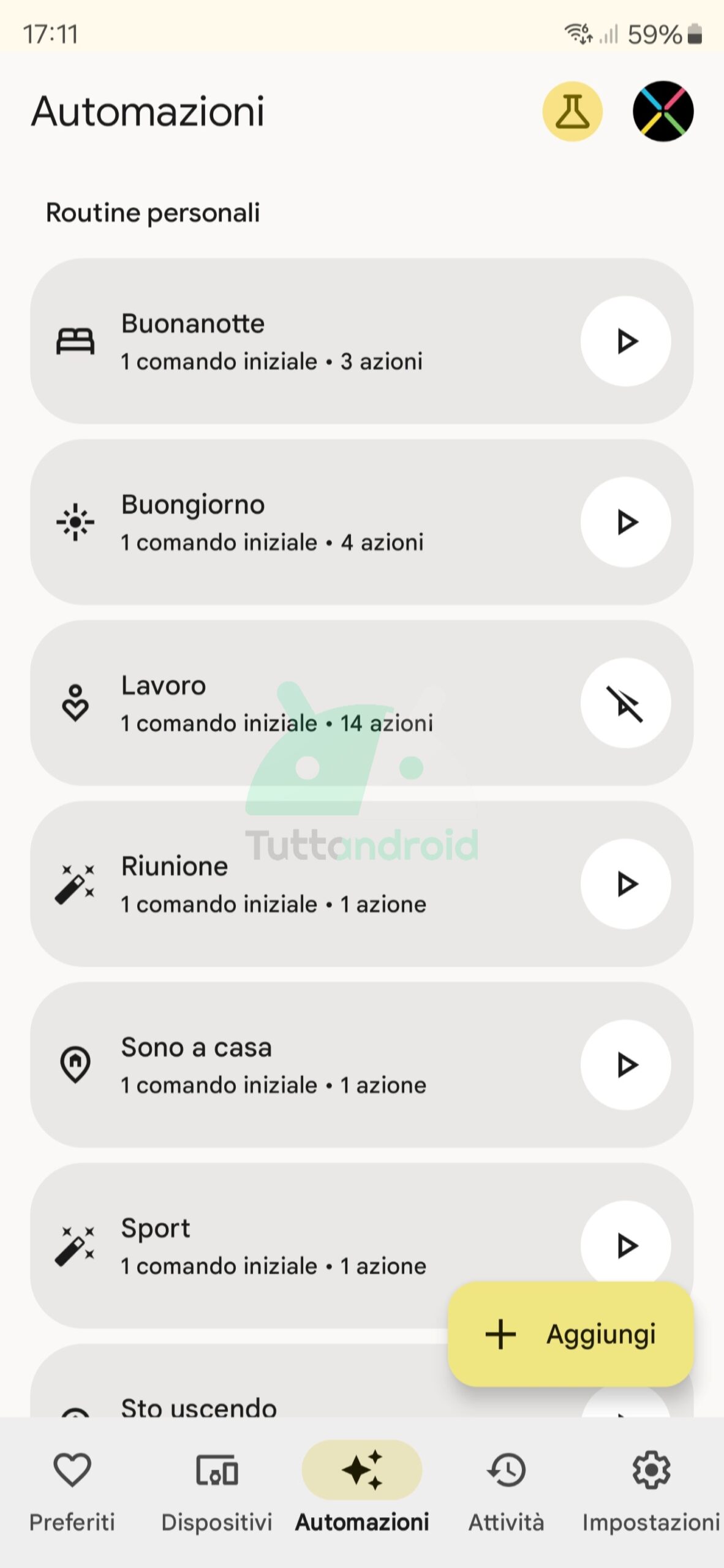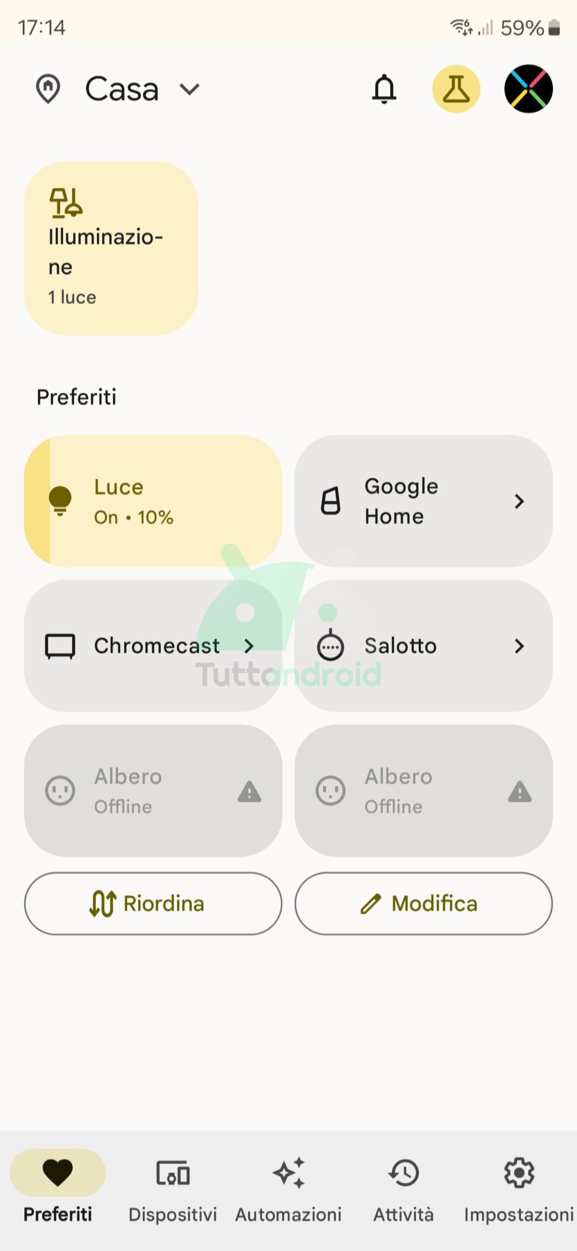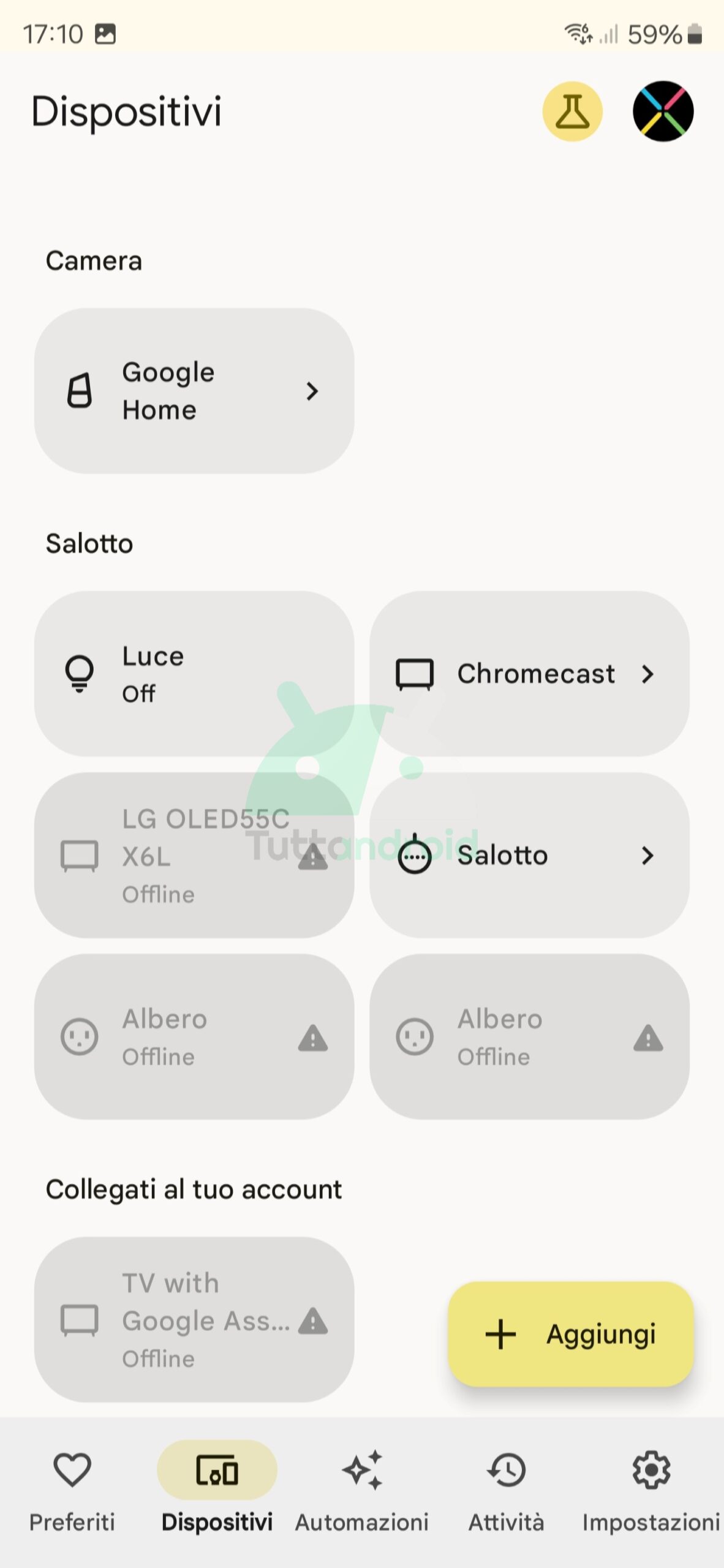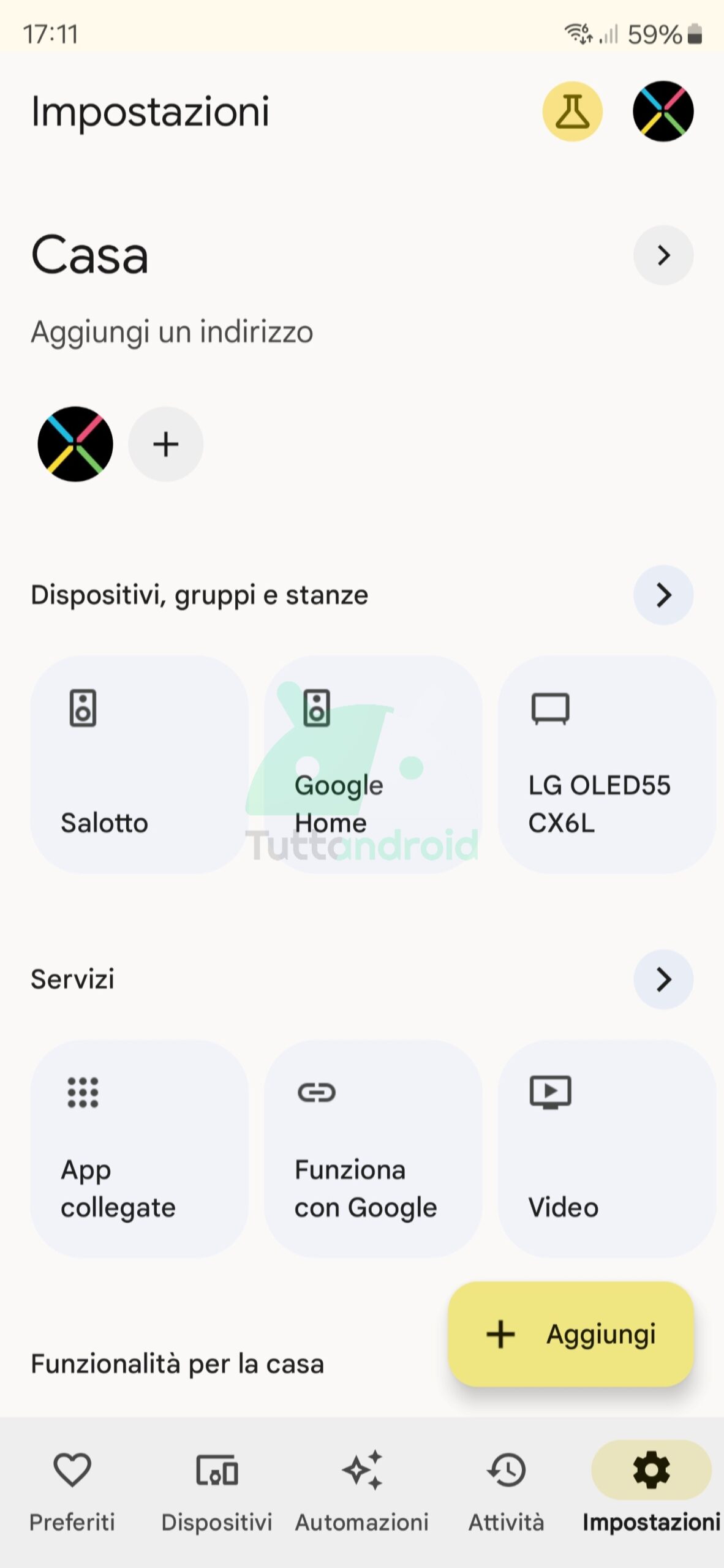 - Dispositivi: schermata simile a quella dei preferiti, ma con tutti i dispositivi della smart home collegati e suddivisi nelle varie stanze (se configurate); il pulsante “Aggiungi” permette di accedere a una procedura guidata per aggiungere un nuovo dispositivo smart, tra quelli compatibili con Matter, quelli della gamma Nest o dei partner.