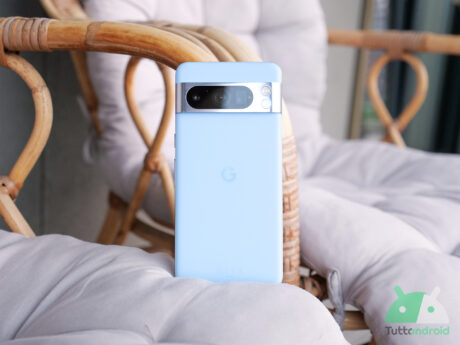 La parte posteriore è caratterizzata da un’ampia fascia in alluminio, chiamata Camera Bar, che ospita il comparto fotografico principale, doppio in questo caso: risulta simile a quella di Pixel 7, ma va a integrarsi ancora meglio con le cornici laterali. Anche stavolta crea uno stacco rispetto al resto della scocca posteriore a livello cromatico (diverso in base alla versione ma in accordo col frame laterale); al suo interno è ritagliata una “pillola” che include gli obiettivi fotografici. Il flash LED prende posto sul lato opposto. I pulsanti sono tutti sul lato destro (power e bilanciere del volume). Sul lato sinistro è presente solo lo slot per la Nano SIM. In basso sono presenti l’altoparlante, il microfono principale e la porta di ricarica USB-C.