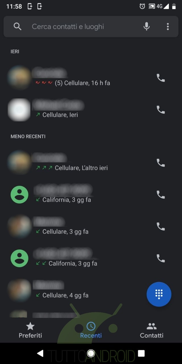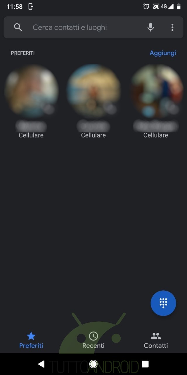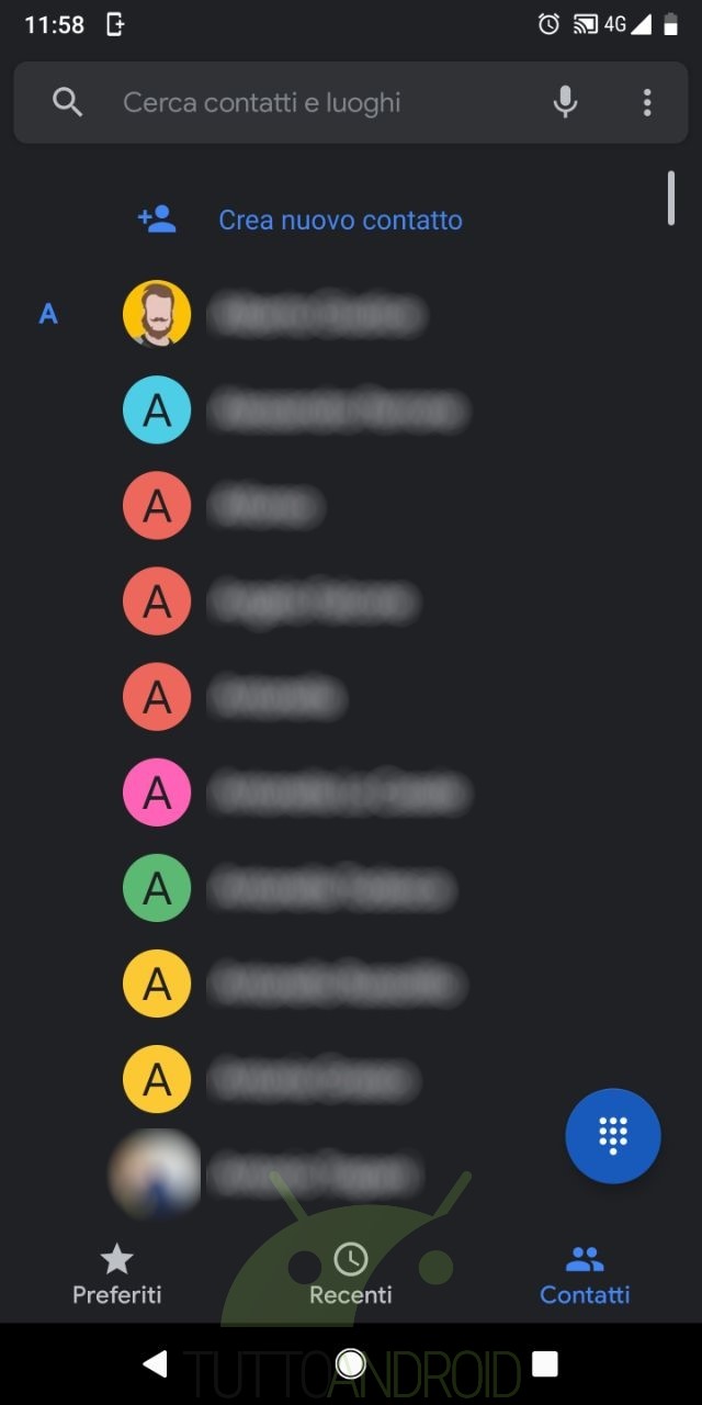Tra i “Preferiti” troviamo i numeri di telefono scelti per l’appunto come contatti preferiti: è possibile aggiungerne premendo in alto a destra. Il pulsante in basso a destra permette di aprire il tastierino telefonico per comporre i numeri (è anche possibile impostarlo aperto all’avvio dell’app). La schermata “Recenti” è anch’essa autoesplicativa e visualizza le ultime chiamate in entrata e in uscita (tra cui quelle perse), mentre “Contatti” mostra i contatti salvati in rubrica, con funzioni limitate rispetto all’apposita applicazione “Google Contatti“.