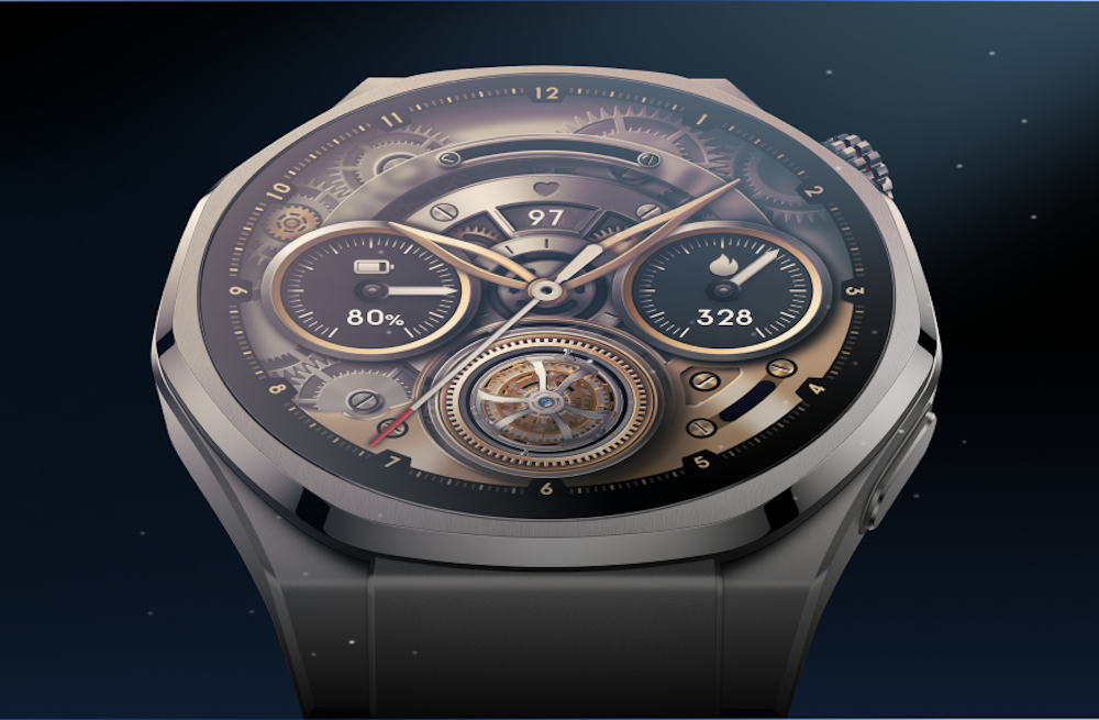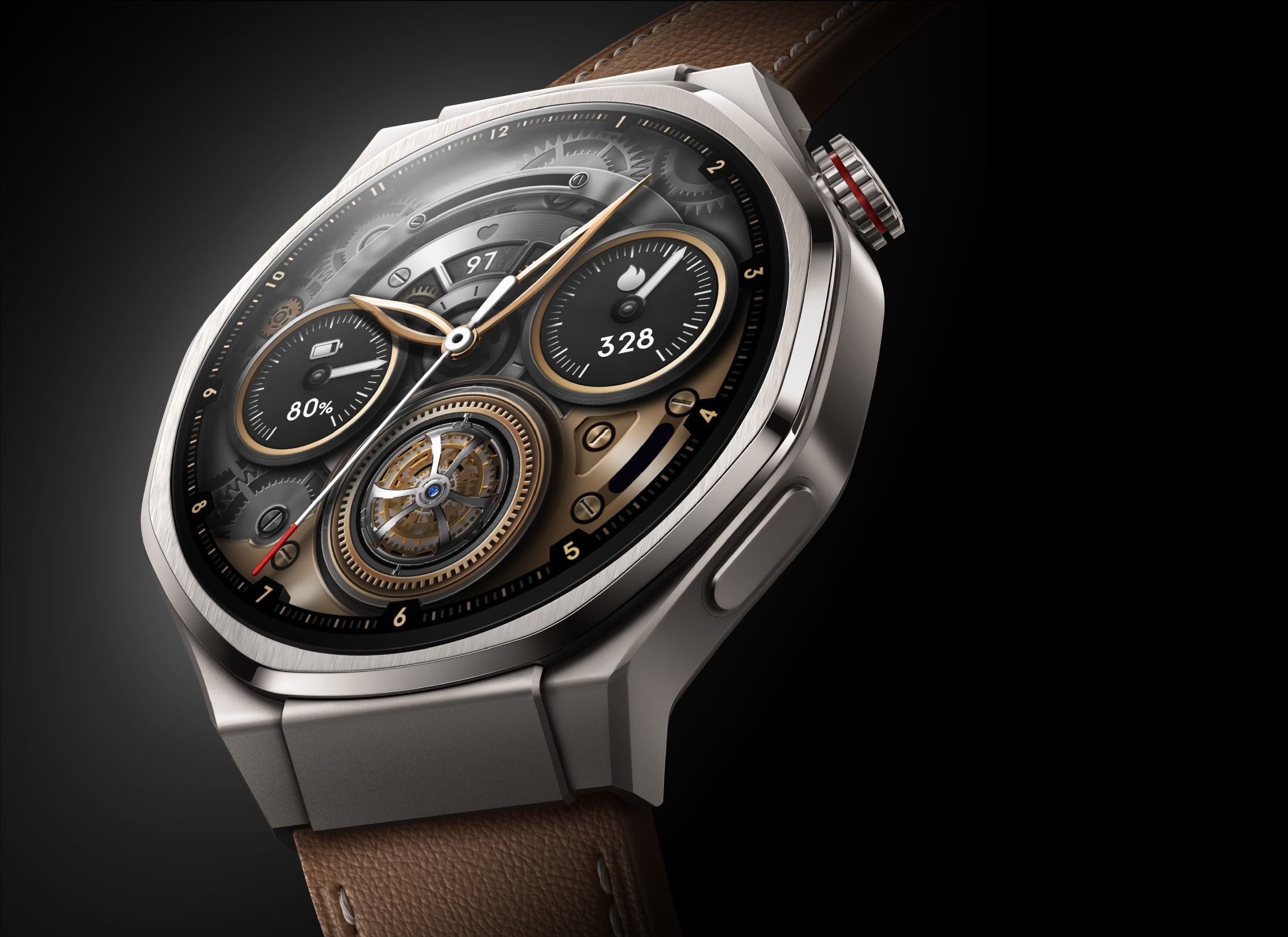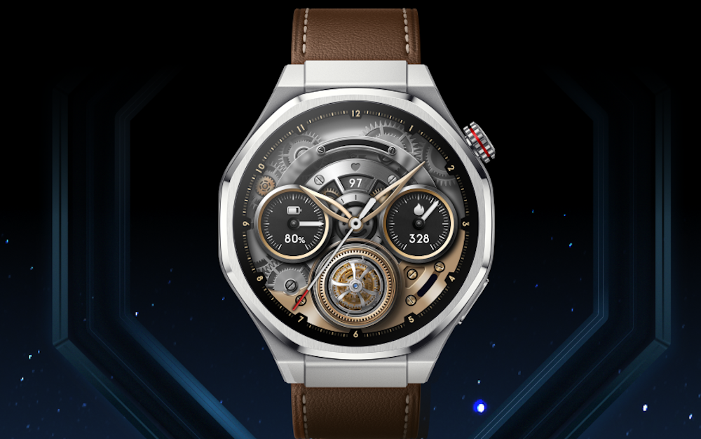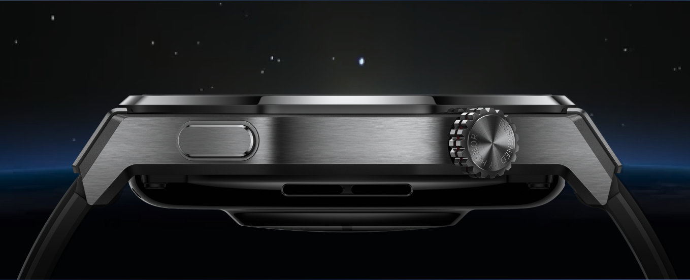 Lo smartwatch offre un design elegante “Space Viewport” con corpo in titanio di grado 5 che unisce linee arrotondate e spigoli pronunciati. Il pannello AMOLED può variare la frequenza di aggiornamento da 1 a 60 Hz ed è protetto da un vetro zaffiro che riduce la possibilità di graffi. Il cinturino ha la classica misura di 22 mm ed è disponibile sia nella versione in pelle marrone sia nella più sportiva variante nera realizzata in fluoroelastomero nero. Due le colorazioni tra cui scegliere.