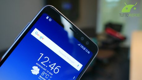 Le cornici superiore e inferiore, pur essendo decisamente ridotte, non raggiungono gli estremi di Galaxy S8, ma si tratta comunque di un ottimo risultato considerando che parliamo di un dispositivo di fascia media. Nella cornice superiore trovano posto tutti i sensori, le due fotocamere e il LED di notifica, oltre ovviamente alla capsula auricolare.