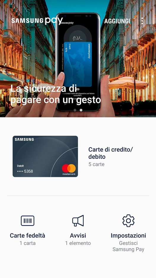 Samsung Pay consente di effettuare pagamenti con lo smartphone Samsung in maniera semplice e sicura con un semplice gesto: nel caso di POS NFC basta aprire l’app e appoggiare il dispositivo. E per quanto riguarda i pagamenti tramite smartwatch, basta avvicinare l’orologio compatibile al terminale di pagamento per completare l’acquisto.