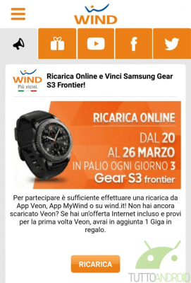 Chi effettuerà da oggi fino al 26 marzo una ricarica online di qualsiasi importo da app Veon, app MyWind o da wind.it avrà diritto a partecipare a un’estrazione giornaliera e vincere uno tra i tre Samsung Gear S3 messi in palio. È tuttavia opportuno sottolineare che ogni SIM parteciperà all’estrazione giornaliera per un numero di volte equivalente al numero di ricariche effettuate in quella stessa giornata, ma fino a un massimo di 5 ricariche al giorno.