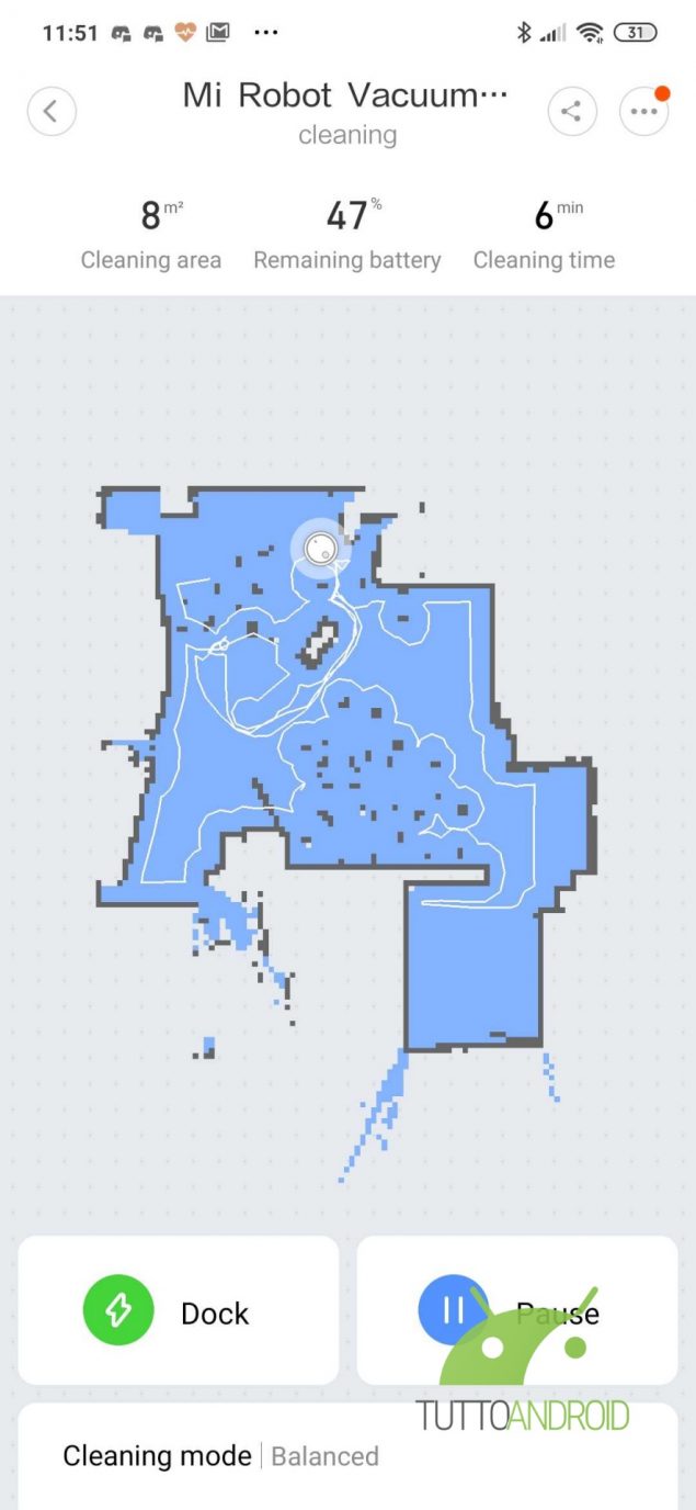 Al termine della “scansione” inizierà la pulizia vera e propria, seguendo un algoritmo che ottimizza la pulizia. Al termine il robot tornerà alla base di ricarica per ripristinare la carica residua. Nel caso la carica scendesse al di sotto del 20%, il robot tornerà autonomamente alla base di ricarica, per riprendere il lavoro dopo essere arrivato all’80%.